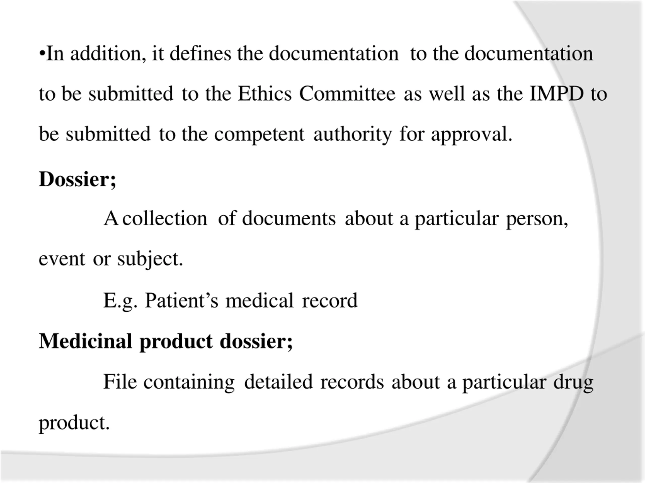 In addition, it defines the documentation to the documentation to be submitted to the Ethics Committee as well as the IMPD to be submitted to the competent authority for approval. Dossier; Acollection of documents about a particular person, event or subject. E.g. Patient s medical record Medicinal product dossier; File containing detailed records about a particular drug product.