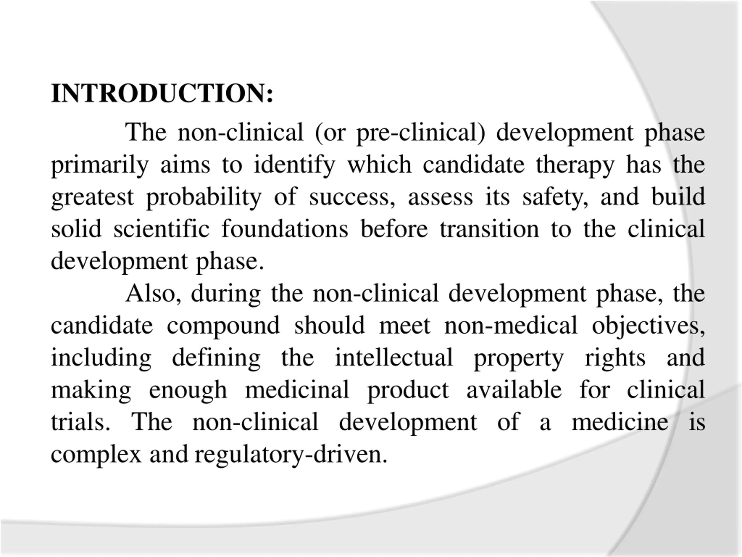 INTRODUCTION: The non-clinical (or pre-clinical) development phase primarily aims to identify which candidate therapy has the greatest probability of success, assess its safety, and build solid scientific foundations before transition to the clinical development phase. Also, during the non-clinical development phase, the candidate compound should meet non-medical objectives, including defining the intellectual property rights and making enough medicinal product available for clinical trials. The non-clinical development of a medicine is complex and regulatory-driven.