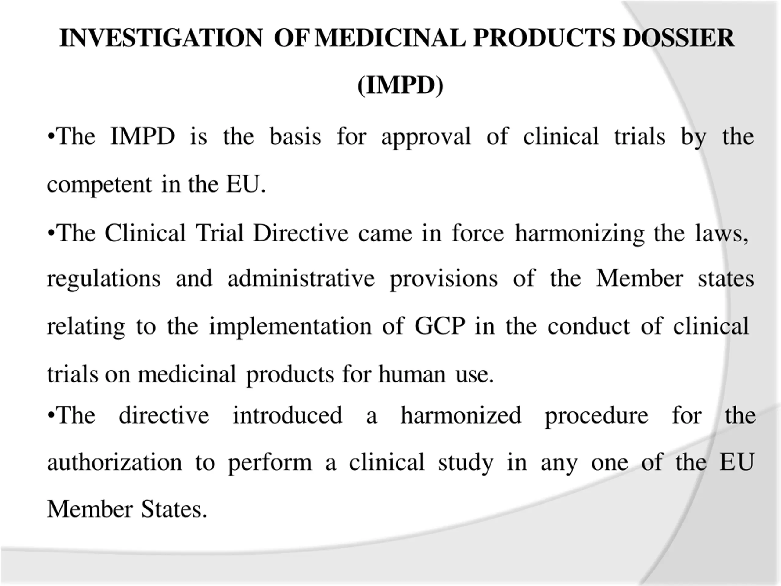 INVESTIGATION OFMEDICINAL PRODUCTS DOSSIER (IMPD) The IMPD is the basis for approval of clinical trials by the competent in the EU. The Clinical Trial Directive came in force harmonizing the laws, regulations and administrative provisions of the Member states relating to the implementation of GCP in the conduct of clinical trials on medicinal products for human use. The directive introduced a harmonized procedure for the authorization to perform a clinical study in any one of the EU Member States.