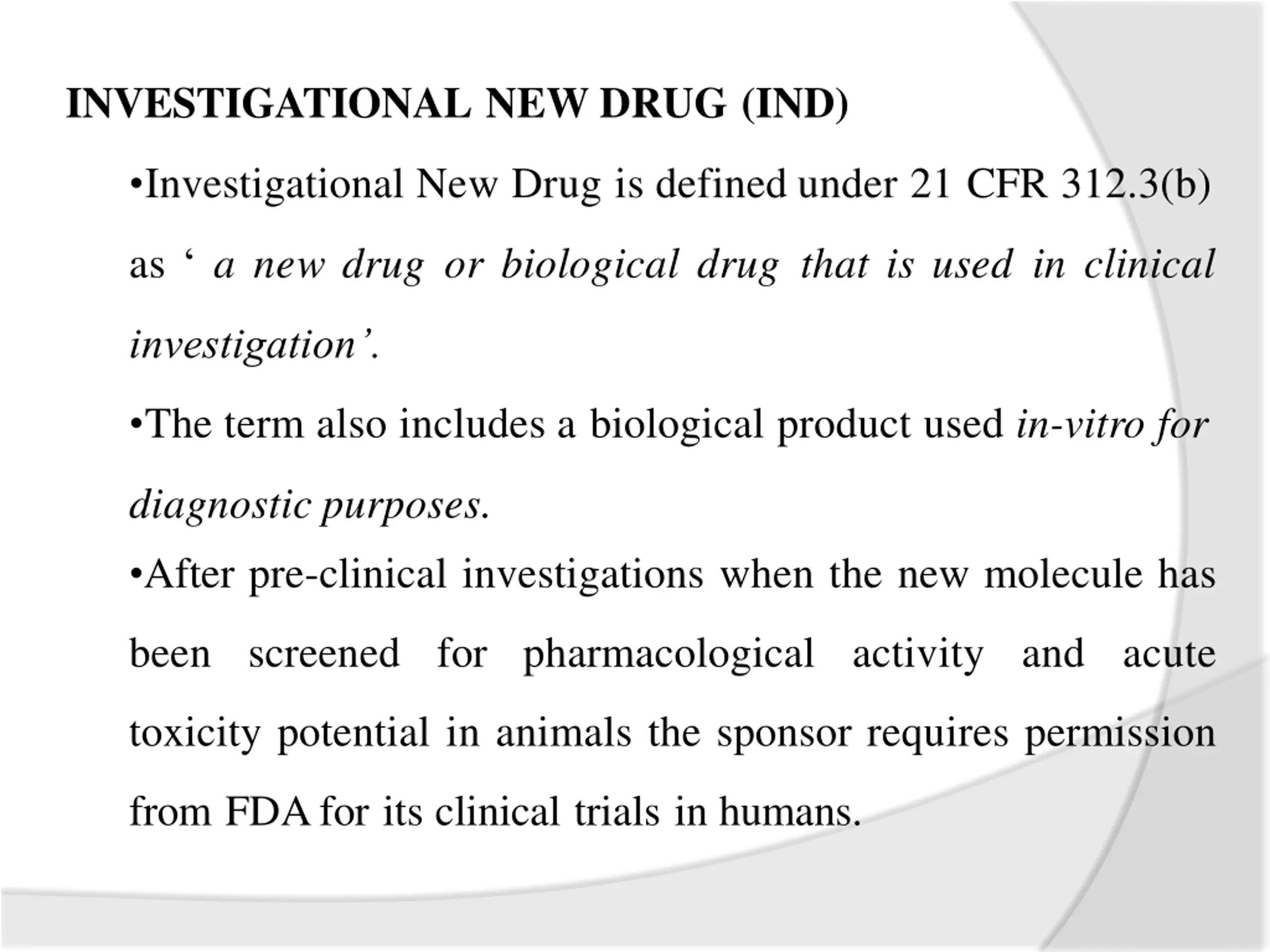INVESTIGATIONAL NEW DRUG (IND) Investigational New Drug is defined under 21 CFR 312.3(b) as a new drug or biological drug that is used in clinical investigation . The term also includes a biological product used in-vitro for diagnostic purposes. After pre-clinical investigations when the new molecule has been screened for pharmacological activity and acute toxicity potential in animals the sponsor requires permission from FDAfor its clinical trials in humans.