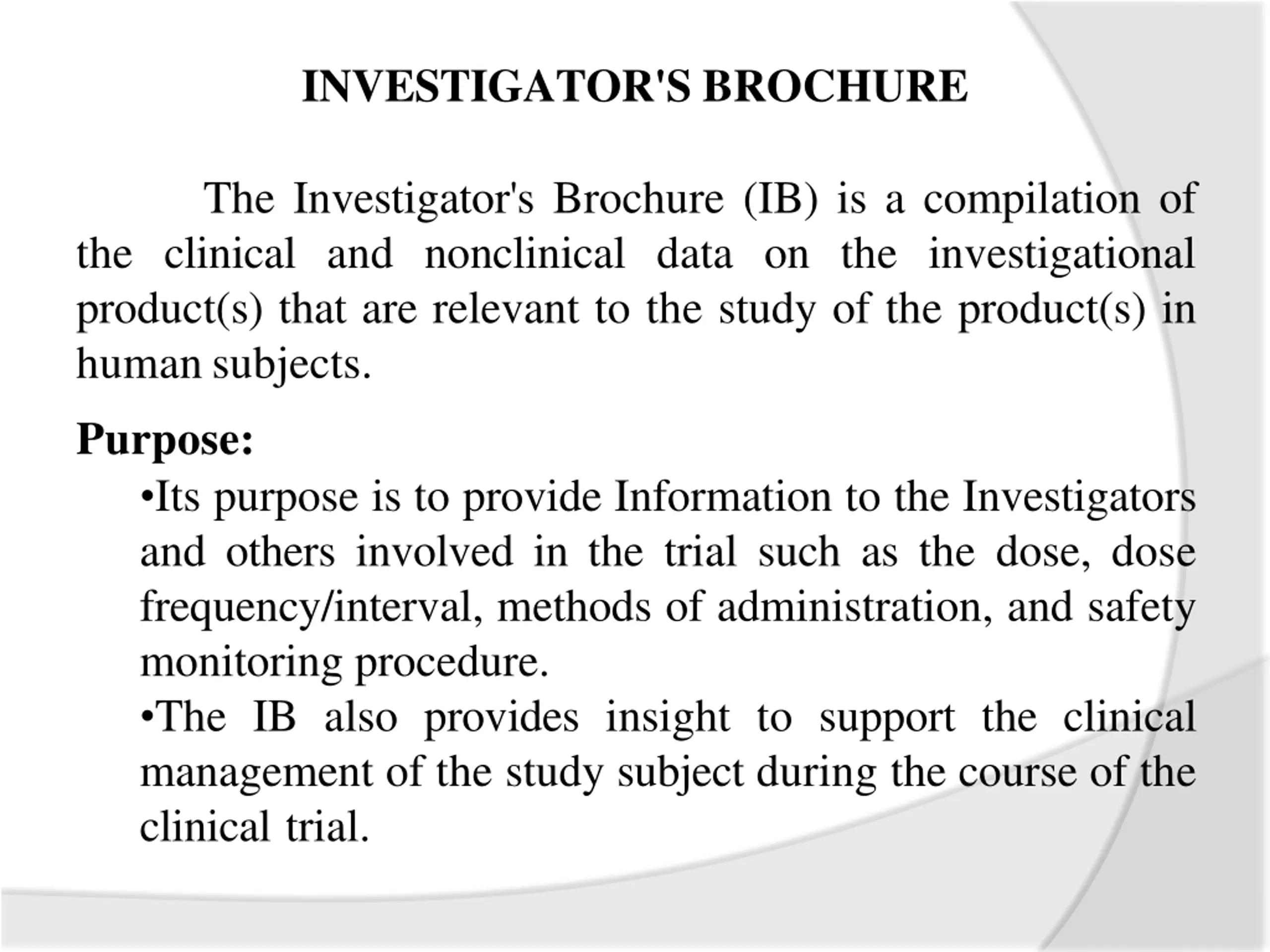 INVESTIGATOR'S BROCHURE The Investigator's Brochure (IB) is a compilation of the clinical and nonclinical data on the investigational product(s) that are relevant to the study of the product(s) in humansubjects. Purpose: Its purpose is to provide Information to the Investigators and others involved in the trial such as the dose, dose frequency/interval, methods of administration, and safety monitoring procedure. The IB also provides insight to support the clinical management of the study subject during the course of the clinical trial.