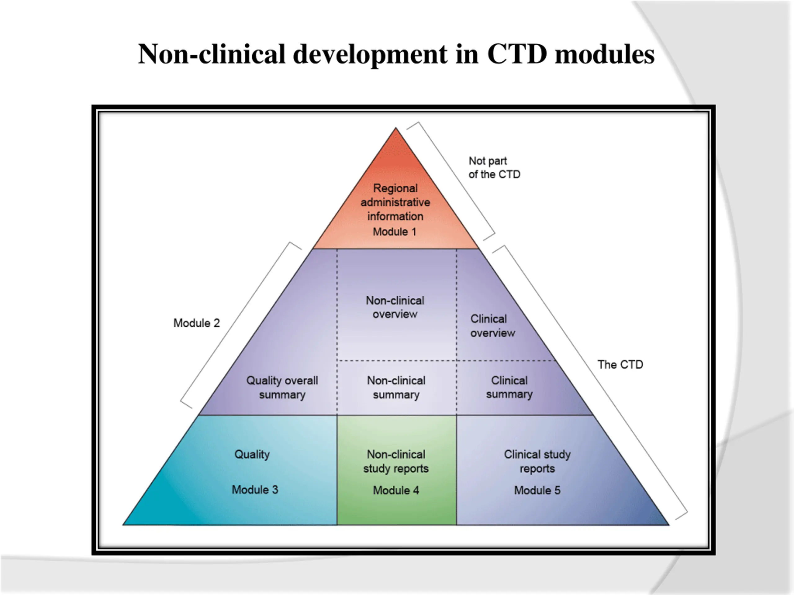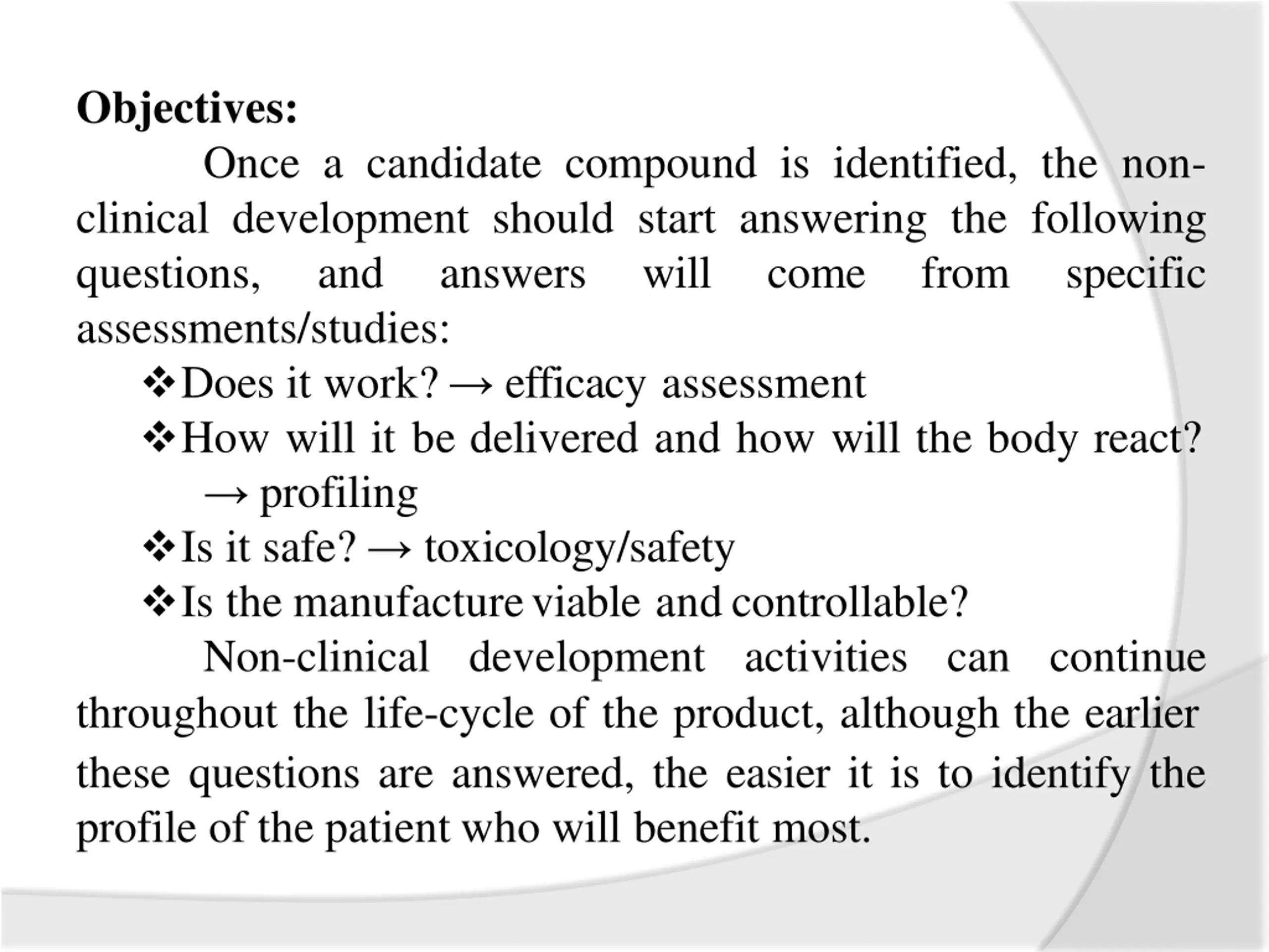 Objectives: Once a candidate compound is identified, the non- clinical development should start answering the following questions, and answers assessments/studies: Does it work? efficacy assessment How will it be delivered and how will the body react? profiling Is it safe? toxicology/safety Is the manufactureviable andcontrollable? Non-clinical development activities can continue throughout the life-cycle of the product, although the earlier these questions are answered, the easier it is to identify the profile of the patient who will benefit most. will come from specific
