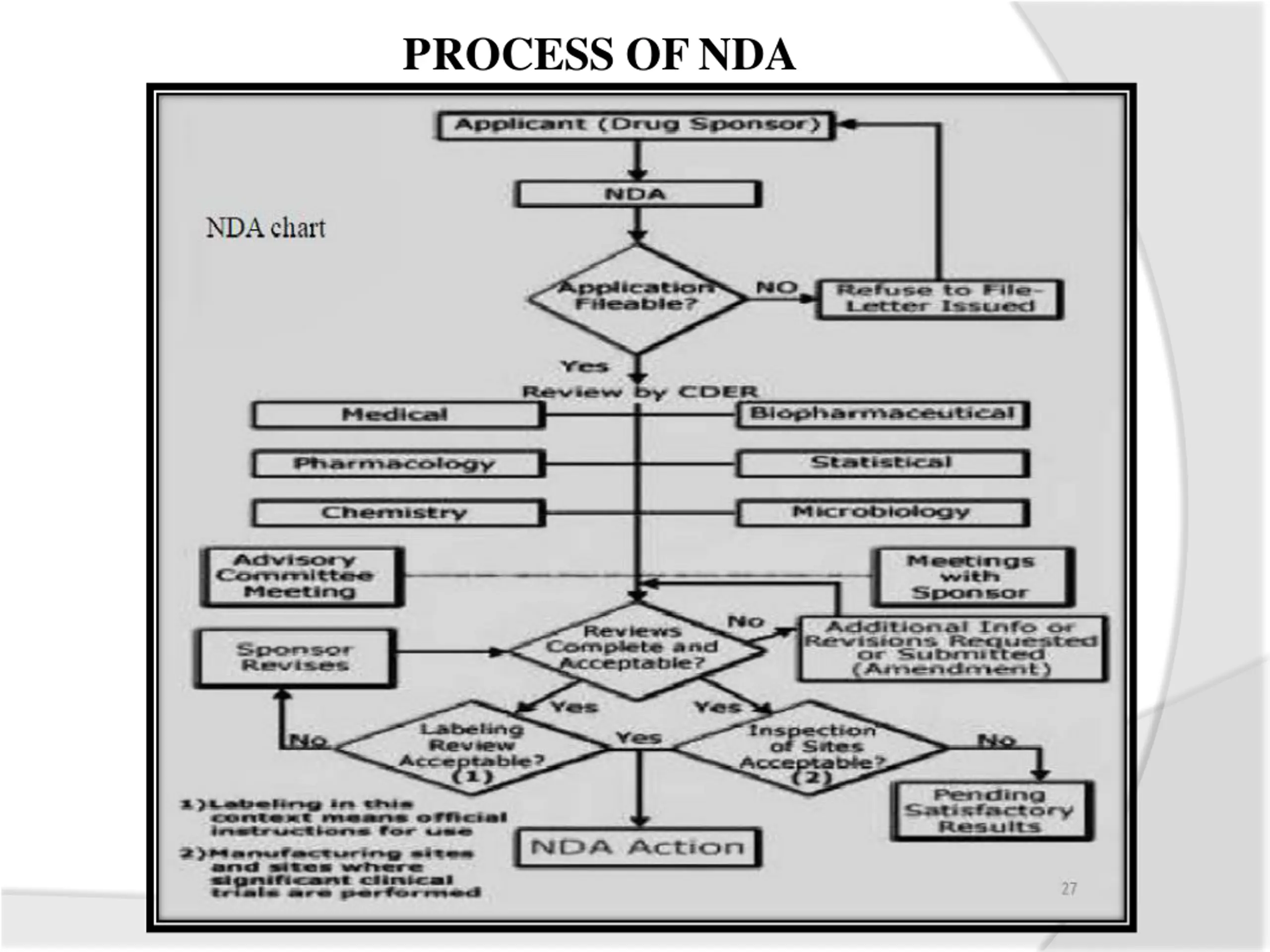NEW DRUGAPPLICATION(NDA) The New Drug Application is the vehicle through which the drug sponsors formally propose FDA or DCGI to approve a new investigational drug for sale and marketing after PhaseIIIA Pivot trials. The official definition of New Drug is in Sec 201(p) of Federal Drug, Food and CosmeticsAct as; Any new drug , the composition of which is such that it is not recognized among experts qualified by scientific training as safe and effective for use under prescribed, recommended or suggested conditions.