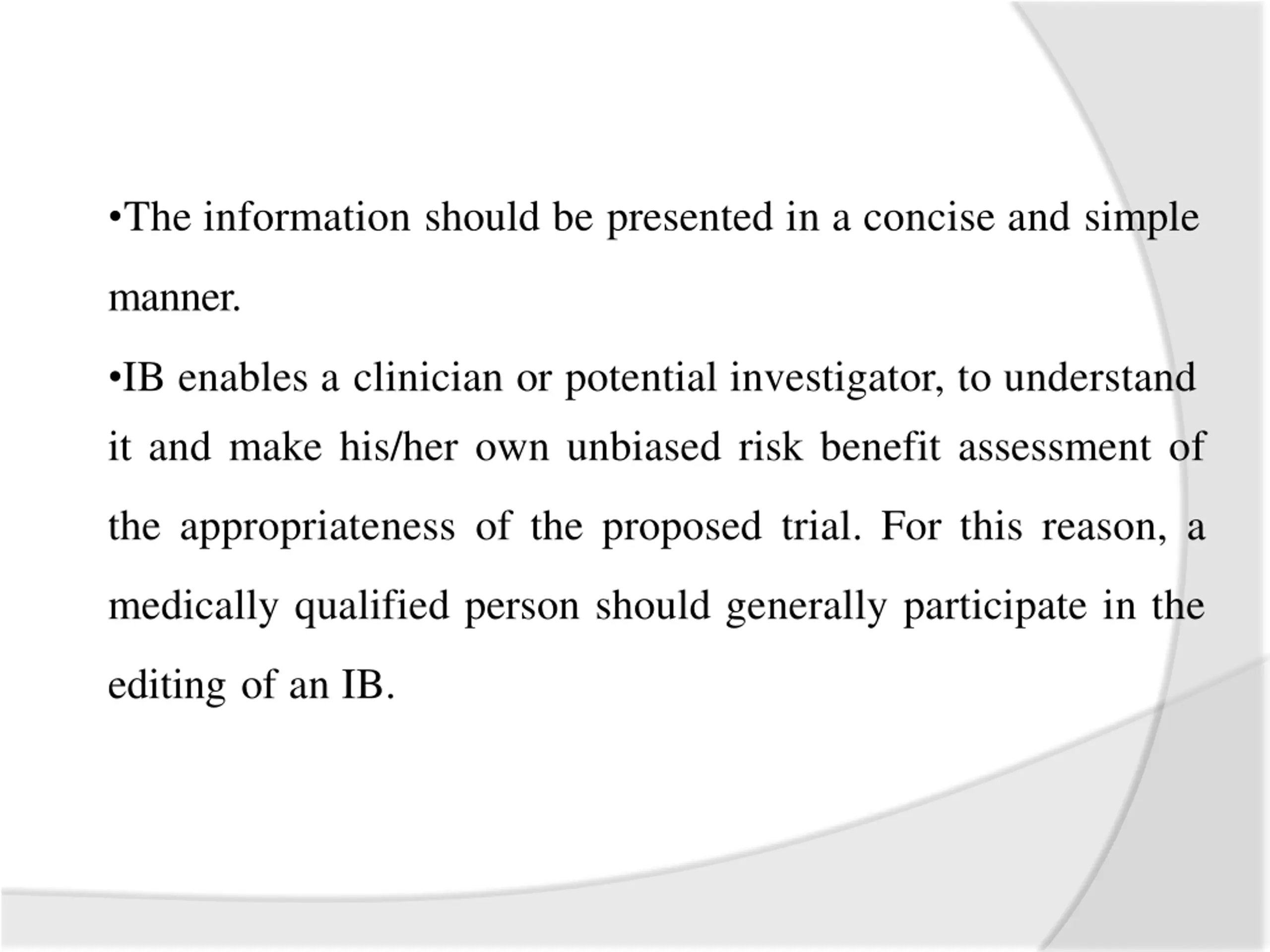 The information should be presented in a concise and simple manner. IB enables a clinician or potential investigator, to understand it and make his/her own unbiased risk benefit assessment of the appropriateness of the proposed trial. For this reason, a medically qualified person should generally participate in the editing of an IB.