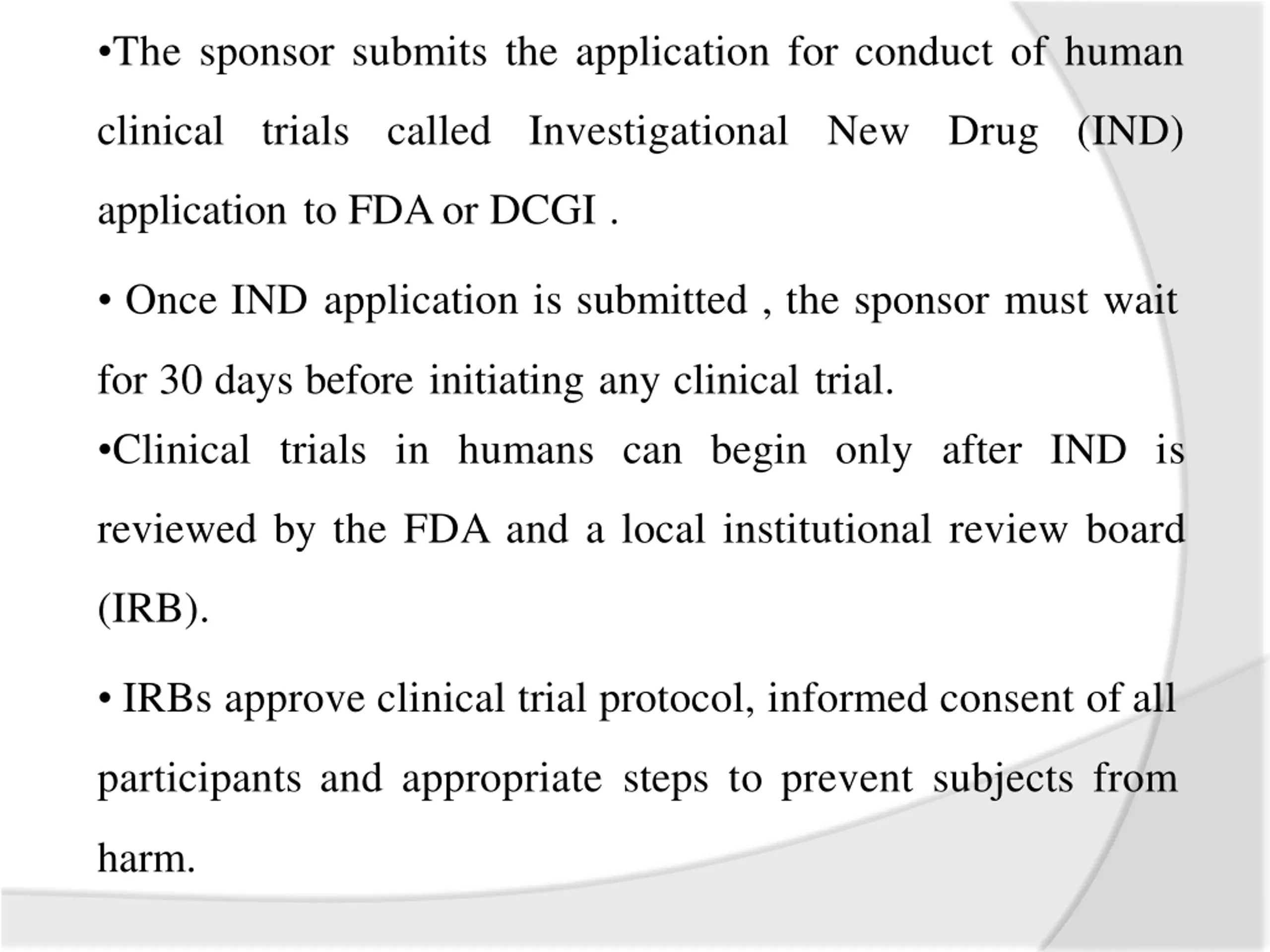The sponsor submits the application for conduct of human clinical trials called Investigational New Drug (IND) application to FDAor DCGI . Once IND application is submitted , the sponsor must wait for 30 days before initiating any clinical trial. Clinical trials in humans can begin only after IND is reviewed by the FDA and a local institutional review board (IRB). IRBs approve clinical trial protocol, informed consent of all participants and appropriate steps to prevent subjects from harm.