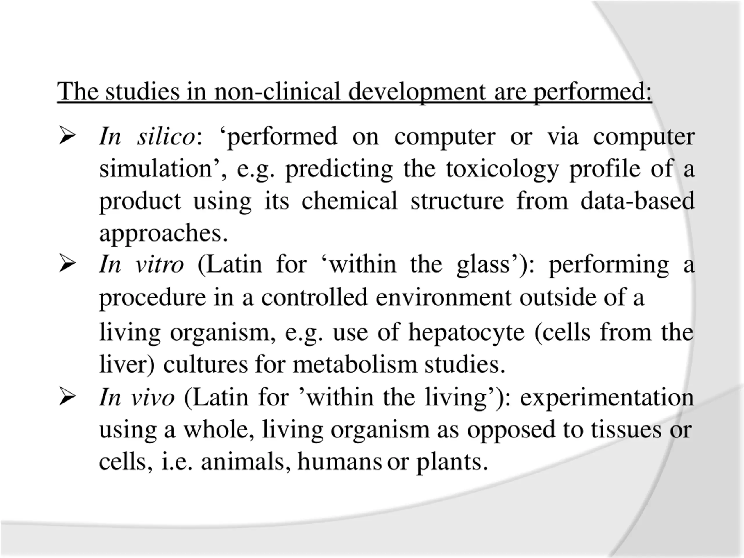The studies in non-clinical development are performed: In silico: performed on computer or via computer simulation , e.g. predicting the toxicology profile of a product using its chemical structure from data-based approaches. In vitro (Latin for within the glass ): performing a procedure in a controlled environment outside of a living organism, e.g. use of hepatocyte (cells from the liver) cultures for metabolism studies. In vivo (Latin for within the living ): experimentation using a whole, living organism as opposed to tissues or cells, i.e. animals, humansor plants.
