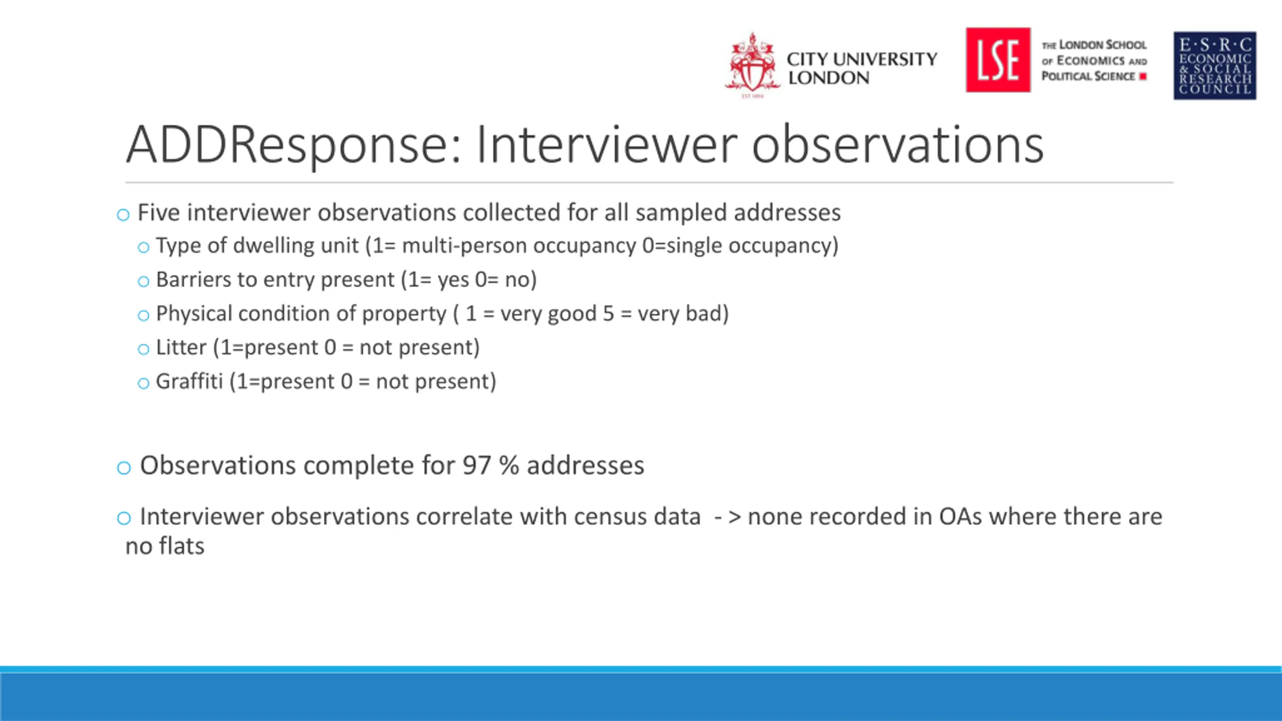 ADDResponse: Interviewer observations o Five interviewer observations collected for all sampled addresses oType of dwelling unit (1= multi-person occupancy 0=single occupancy) oBarriers to entry present (1= yes 0= no) oPhysical condition of property ( 1 = very good 5 = very bad) oLitter (1=present 0 = not present) oGraffiti (1=present 0 = not present) o Observations complete for 97 % addresses oInterviewer observations correlate with census data - > none recorded in OAs where there are no flats
