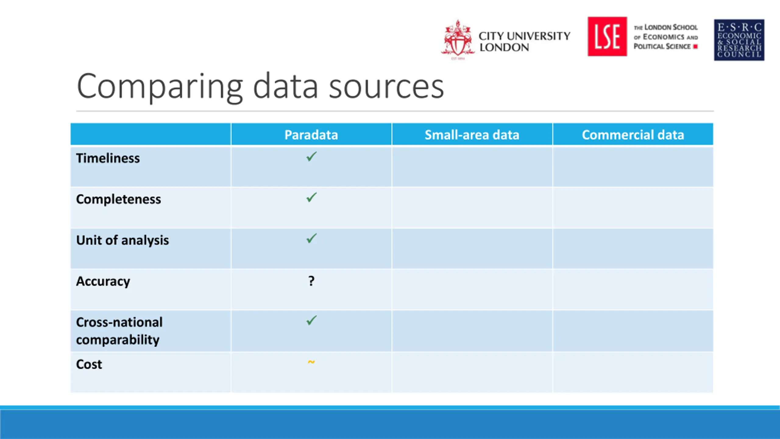 Comparing data sources Paradata Small-area data Commercial data Timeliness Completeness Unit of analysis Accuracy ? Cross-national comparability Cost ~