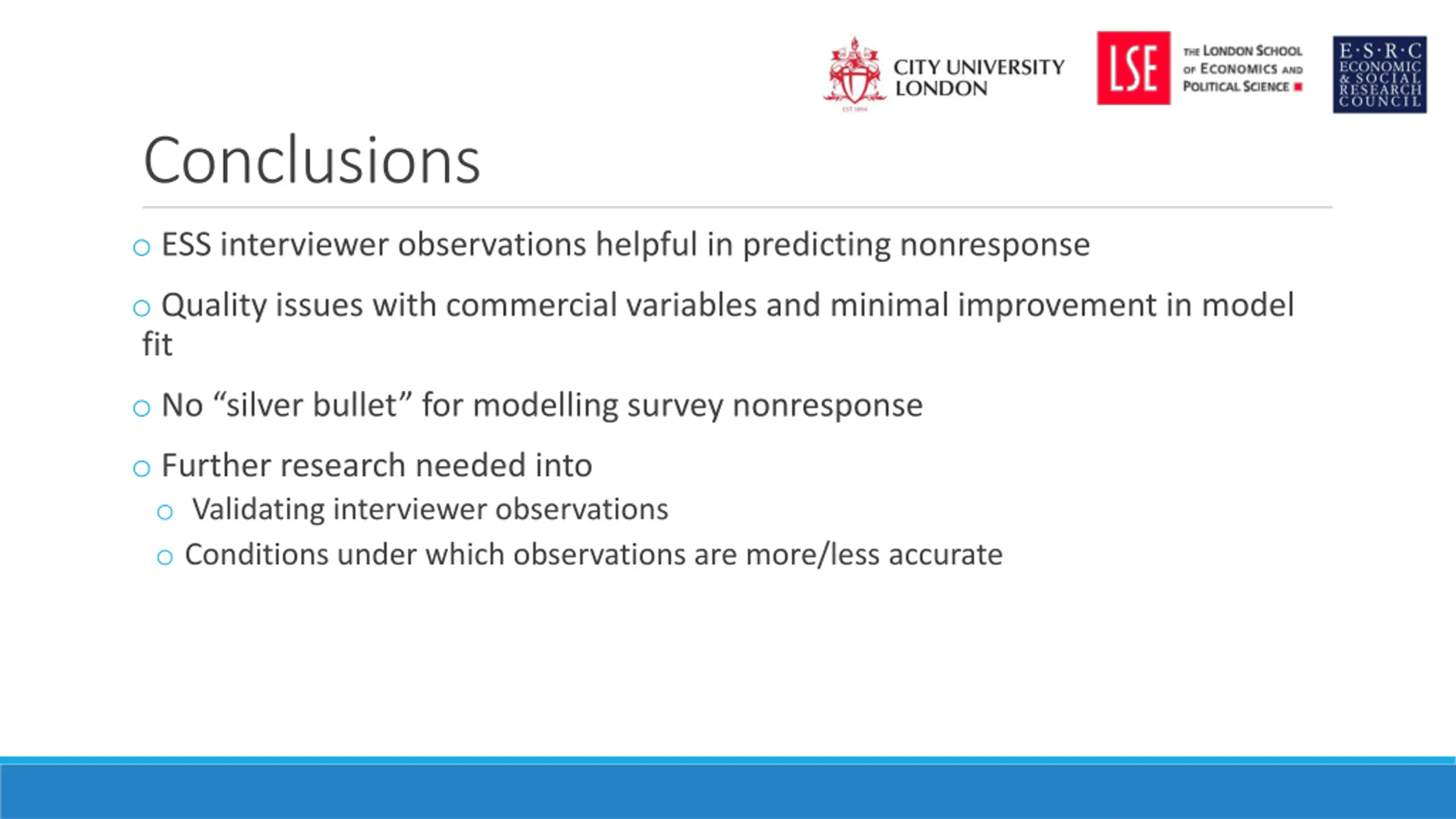 Conclusions o ESS interviewer observations helpful in predicting nonresponse o Quality issues with commercial variables and minimal improvement in model fit oNo silver bullet for modelling survey nonresponse o Further research needed into o Validating interviewer observations o Conditions under which observations are more/less accurate
