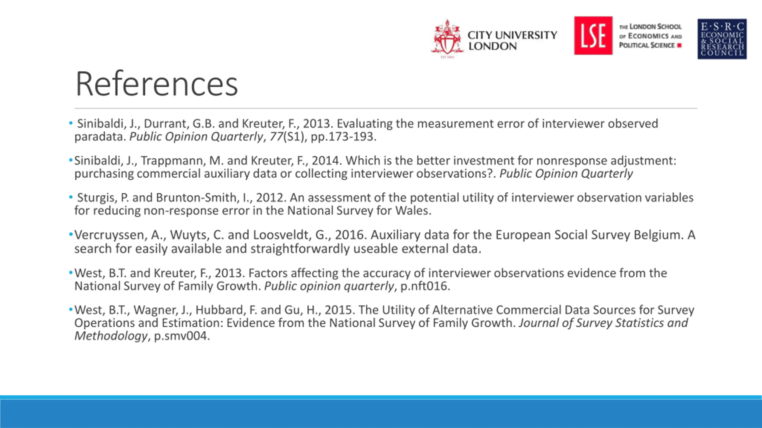 References Sinibaldi, J., Durrant, G.B. and Kreuter, F., 2013. Evaluating the measurement error of interviewer observed paradata. Public Opinion Quarterly, 77(S1), pp.173-193. Sinibaldi, J., Trappmann, M. and Kreuter, F., 2014. Which is the better investment for nonresponse adjustment: purchasing commercial auxiliary data or collecting interviewer observations?. Public Opinion Quarterly Sturgis, P. and Brunton-Smith, I., 2012. An assessment of the potential utility of interviewer observation variables for reducing non-response error in the National Survey for Wales. Vercruyssen, A., Wuyts, C. and Loosveldt, G., 2016. Auxiliary data for the European Social Survey Belgium. A search for easily available and straightforwardly useable external data. West, B.T. and Kreuter, F., 2013. Factors affecting the accuracy of interviewer observations evidence from the National Survey of Family Growth. Public opinion quarterly, p.nft016. West, B.T., Wagner, J., Hubbard, F. and Gu, H., 2015. The Utility of Alternative Commercial Data Sources for Survey Operations and Estimation: Evidence from the National Survey of Family Growth. Journal of Survey Statistics and Methodology, p.smv004.