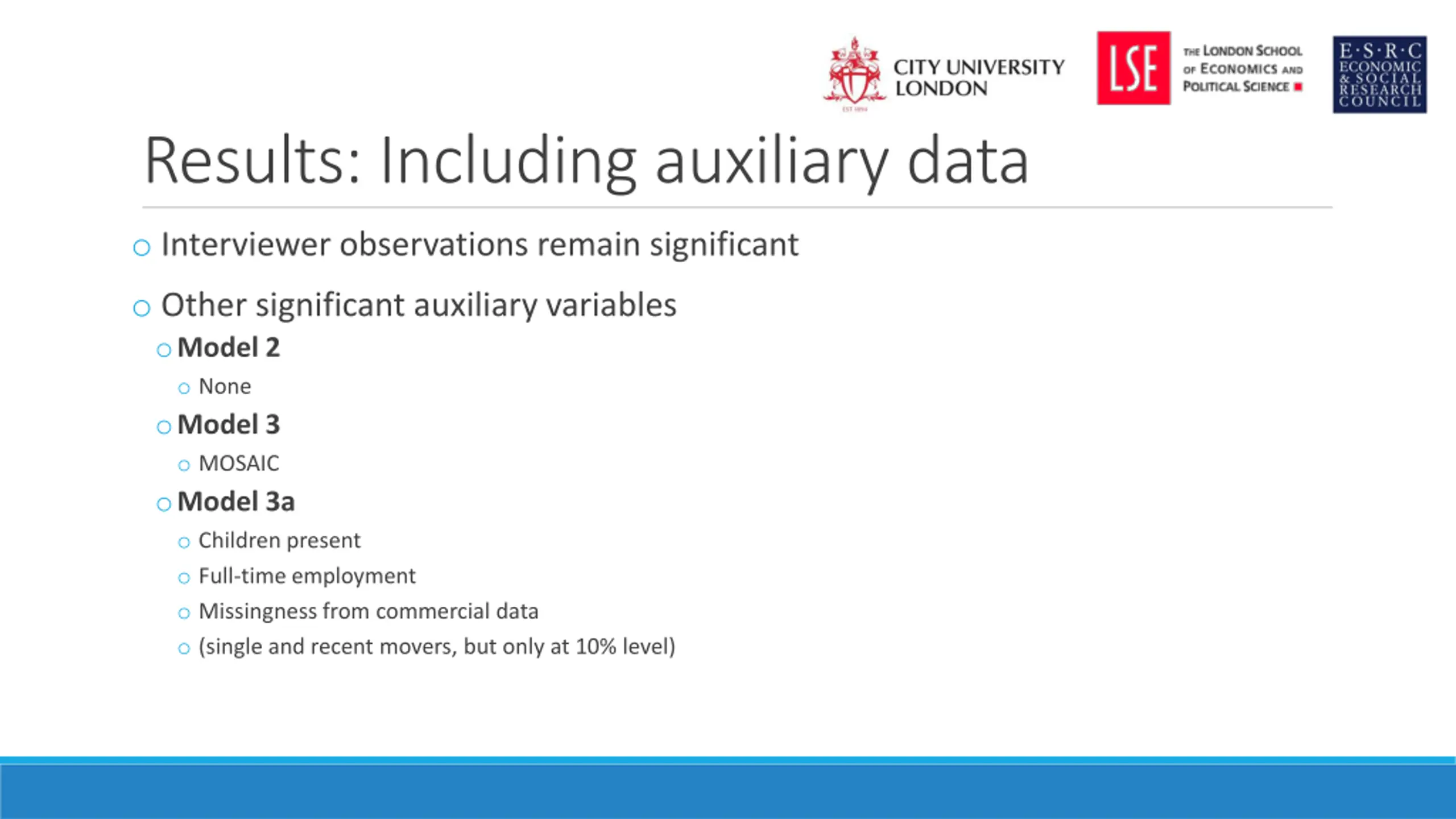 Results: Including auxiliary data o Interviewer observations remain significant o Other significant auxiliary variables oModel 2 o None oModel 3 o MOSAIC oModel 3a o Children present o Full-time employment o Missingness from commercial data o (single and recent movers, but only at 10% level)