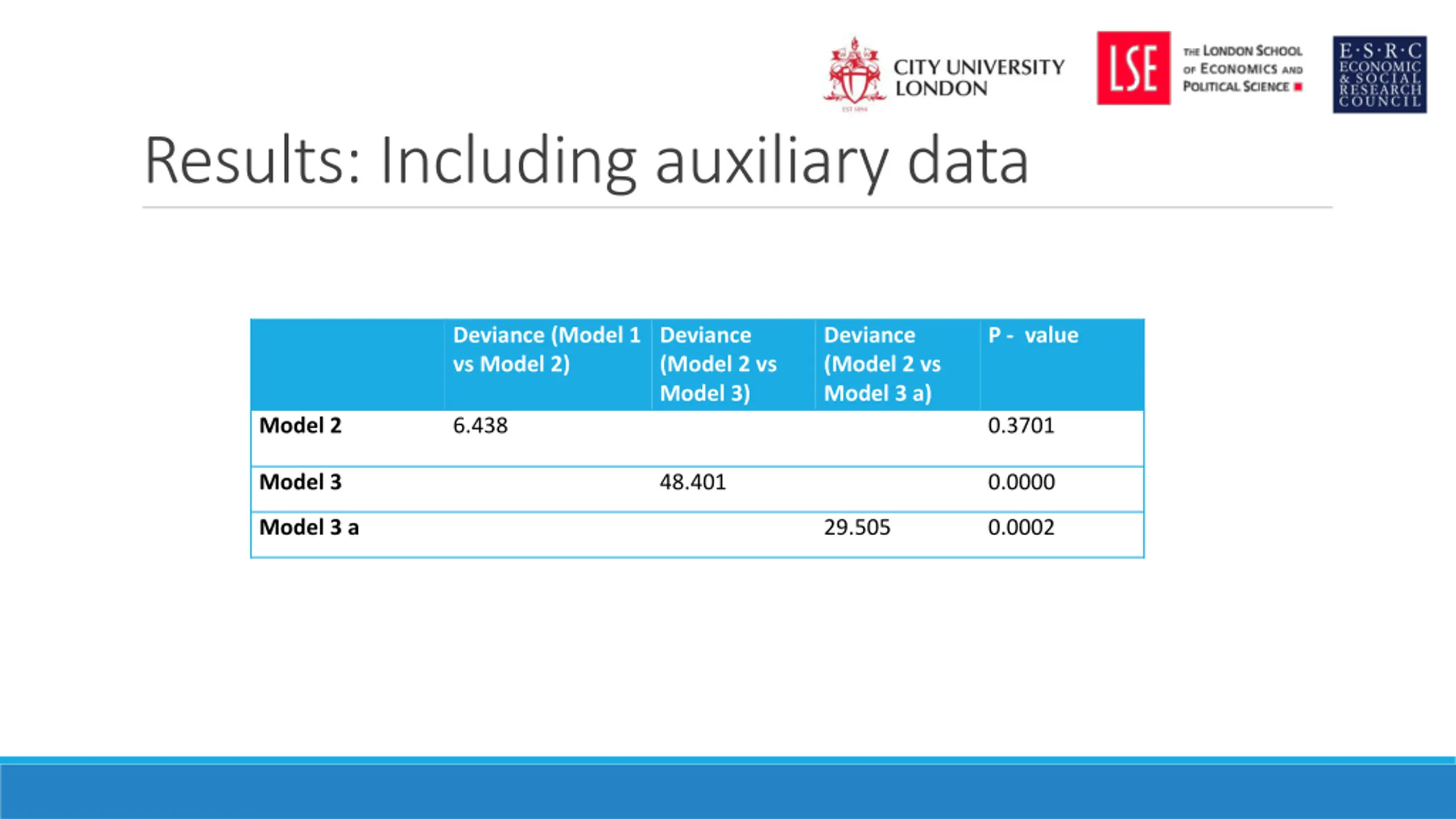 Results: Including auxiliary data Deviance (Model 1 vs Model 2) Deviance (Model 2 vs Model 3) Deviance (Model 2 vs Model 3 a) P - value Model 2 6.438 0.3701 Model 3 48.401 0.0000 Model 3 a 29.505 0.0002