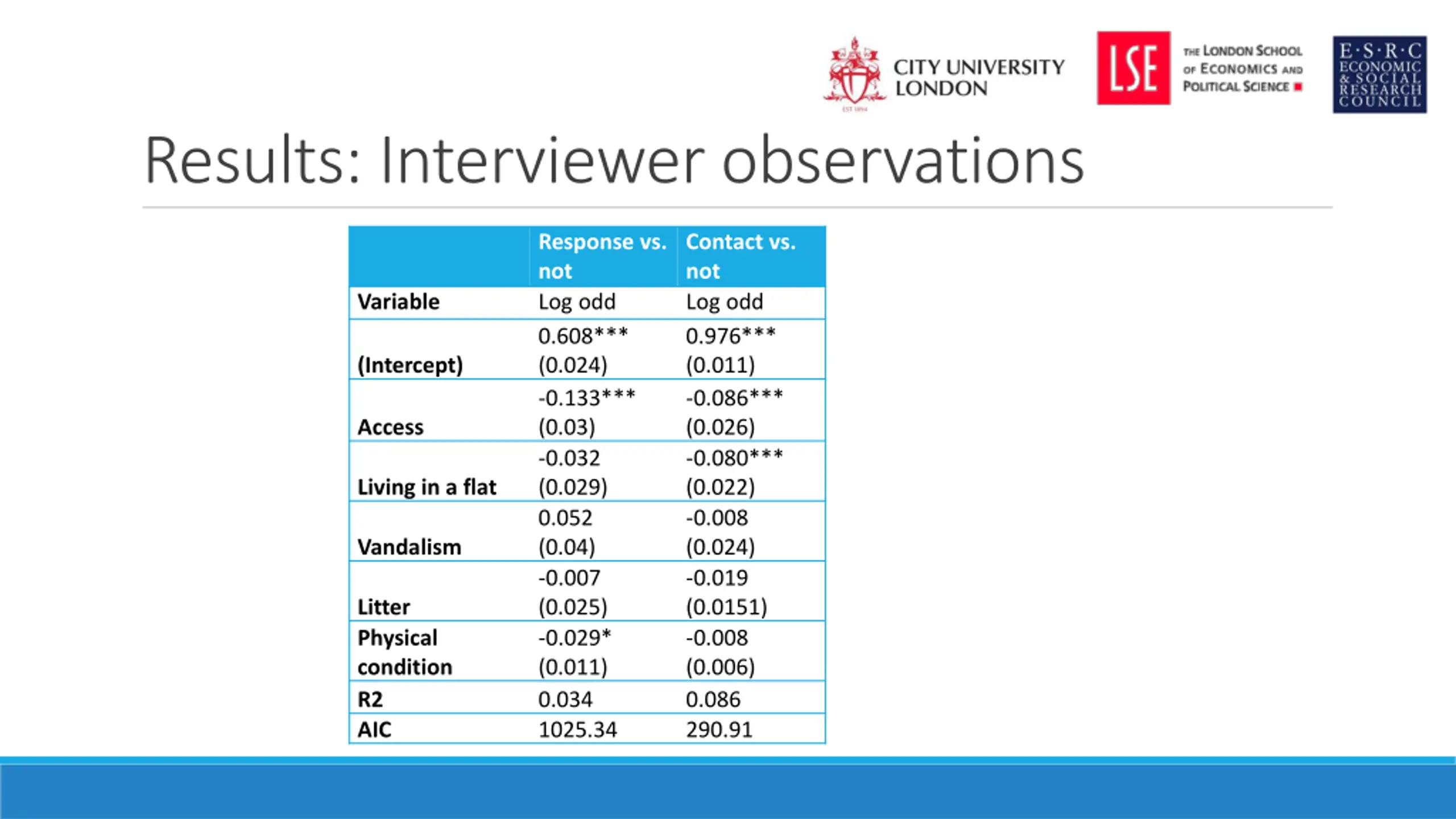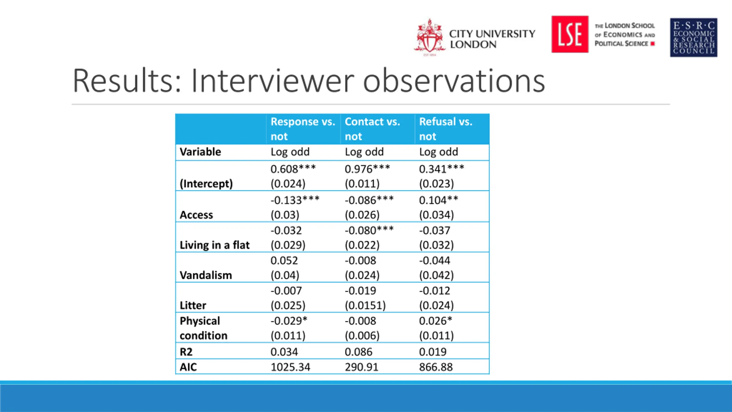 Results: Interviewer observations Response vs. not Log odd 0.608*** (0.024) -0.133*** (0.03) -0.032 (0.029) 0.052 (0.04) -0.007 (0.025) -0.029* (0.011) 0.034 1025.34 Contact vs. not Log odd 0.976*** (0.011) -0.086*** (0.026) -0.080*** (0.022) -0.008 (0.024) -0.019 (0.0151) -0.008 (0.006) 0.086 290.91 Variable (Intercept) Access Living in a flat Vandalism Litter Physical condition R2 AIC