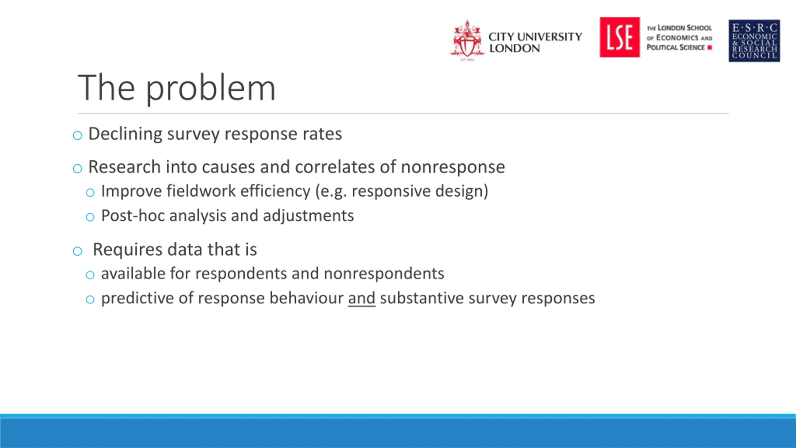 The problem o Declining survey response rates o Research into causes and correlates of nonresponse o Improve fieldwork efficiency (e.g. responsive design) o Post-hoc analysis and adjustments o Requires data that is o available for respondents and nonrespondents o predictive of response behaviour and substantive survey responses