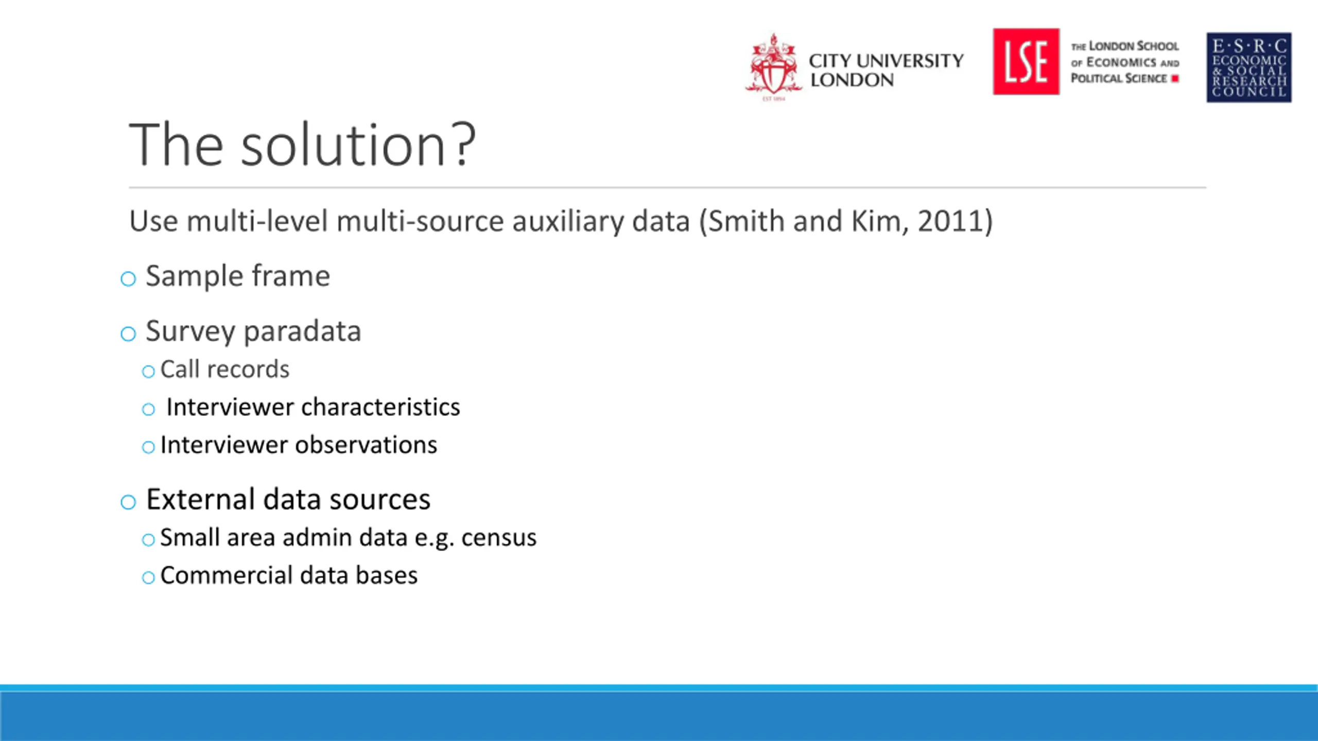 The solution? Use multi-level multi-source auxiliary data (Smith and Kim, 2011) o Sample frame o Survey paradata oCall records o Interviewer characteristics oInterviewer observations o External data sources oSmall area admin data e.g. census oCommercial data bases