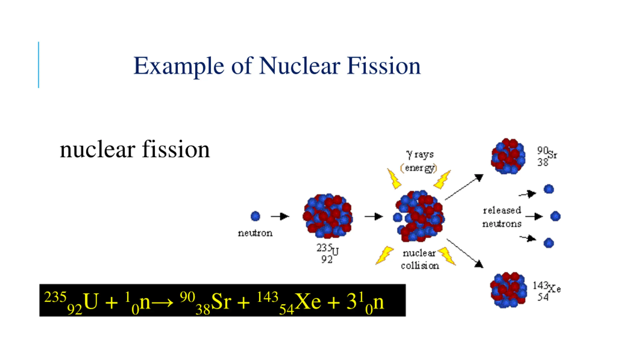 Example of Nuclear Fission nuclear fission 23592U + 10n 9038Sr + 14354Xe + 310n