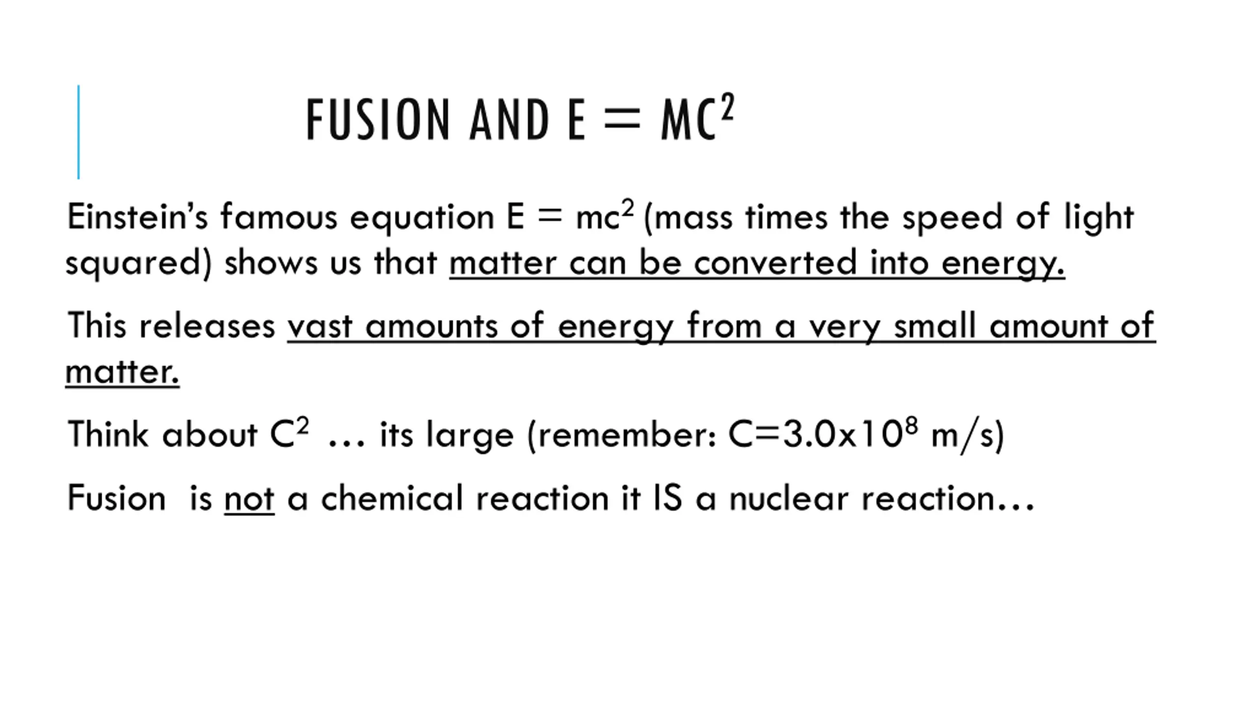 FUSION AND E = MC2 Einstein s famous equation E = mc2 (mass times the speed of light squared) shows us that matter can be converted into energy. This releases vast amounts of energy from a very small amount of matter. Think about C2 its large (remember: C=3.0x108 m/s) Fusion is not a chemical reaction it IS a nuclear reaction