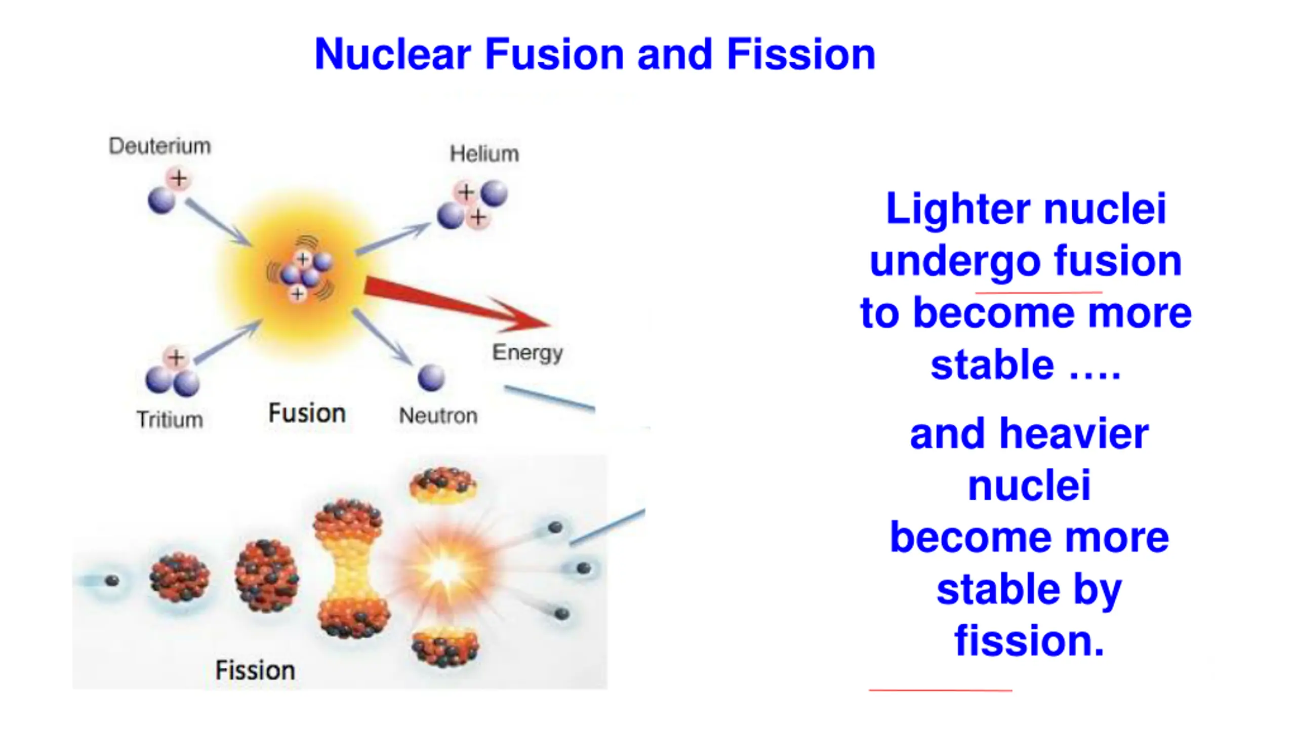 Nuclear Fusion and Fission Lighter nuclei undergo fusion to become more stable . and heavier nuclei become more stable by fission.