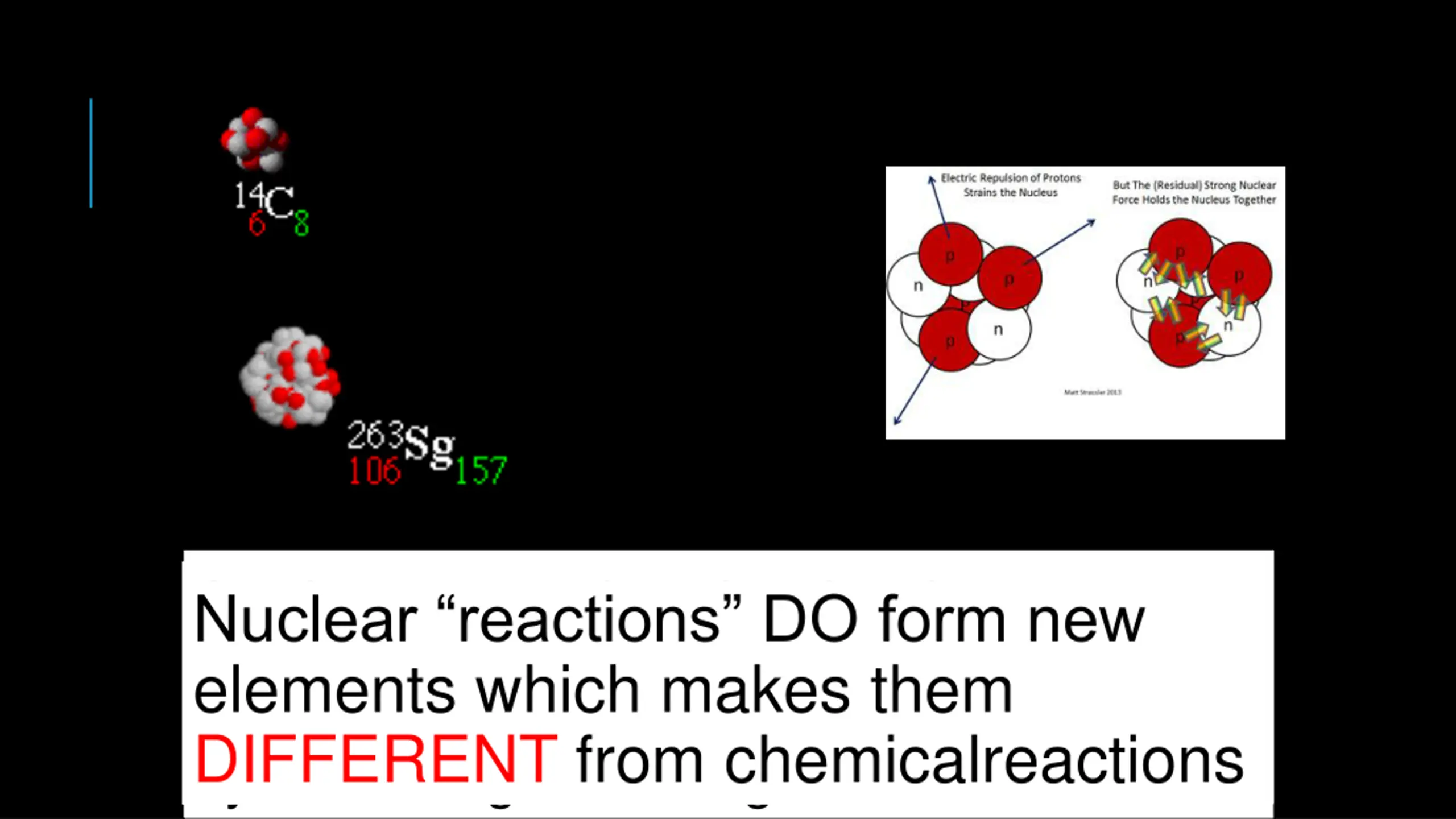 Protons and neutrons are attracted to each other by the strong nuclear to the strong force is greater than the repulsion due to electrostatic force. In a stable nucleus, the attraction due As elements get heavier, they become more unstable. Extra neutrons must be present in the nucleus (like glue) to increase stability Nuclear reactions DO form new elements which makes them Nuclear changes occur when a nucleus becomes unstable. force. by increasing the strong force. DIFFERENT from chemicalreactions