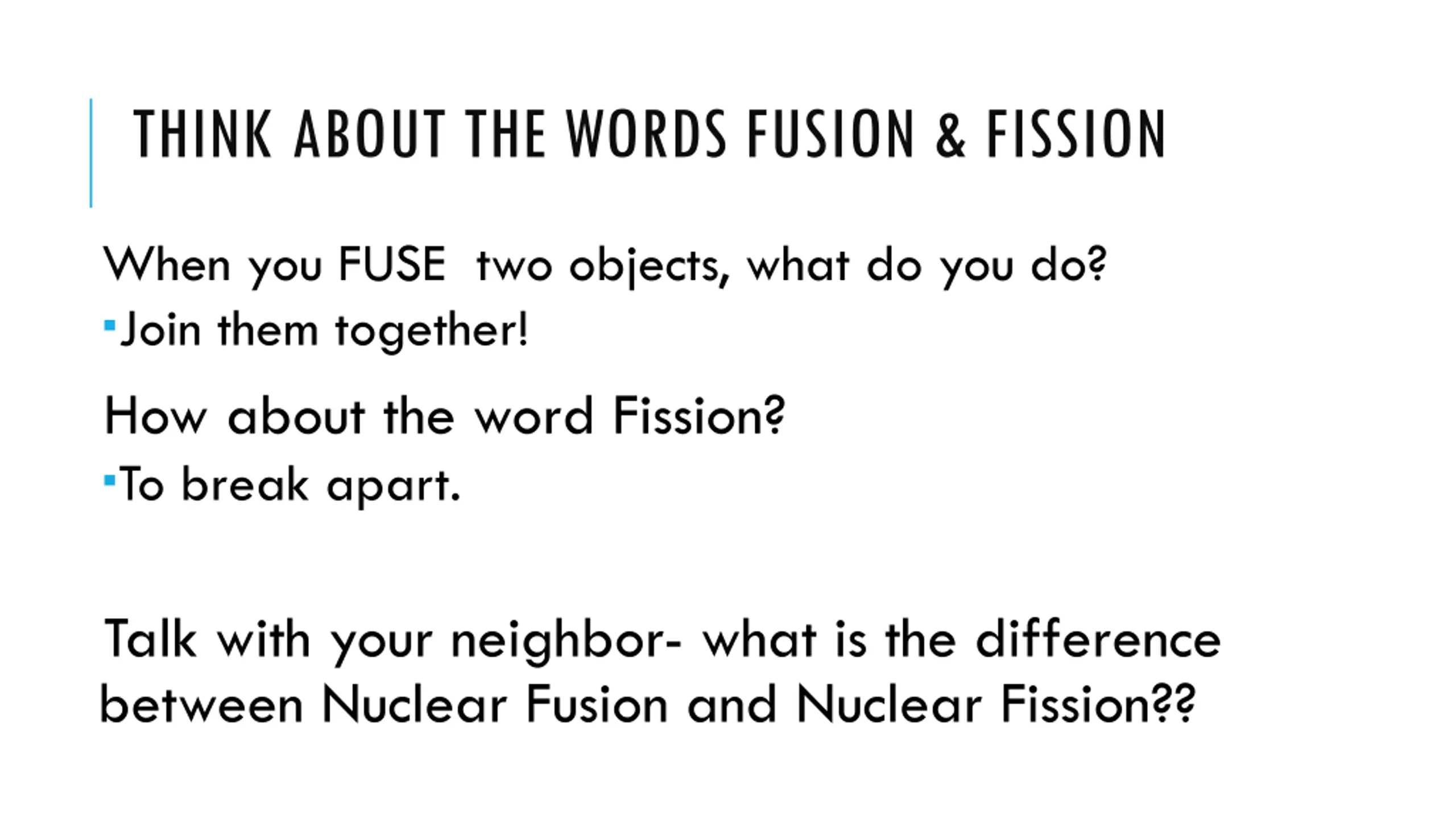 THINK ABOUT THE WORDS FUSION & FISSION When you FUSE two objects, what do you do? Join them together! How about the word Fission? To break apart. Talk with your neighbor- what is the difference between Nuclear Fusion and Nuclear Fission??