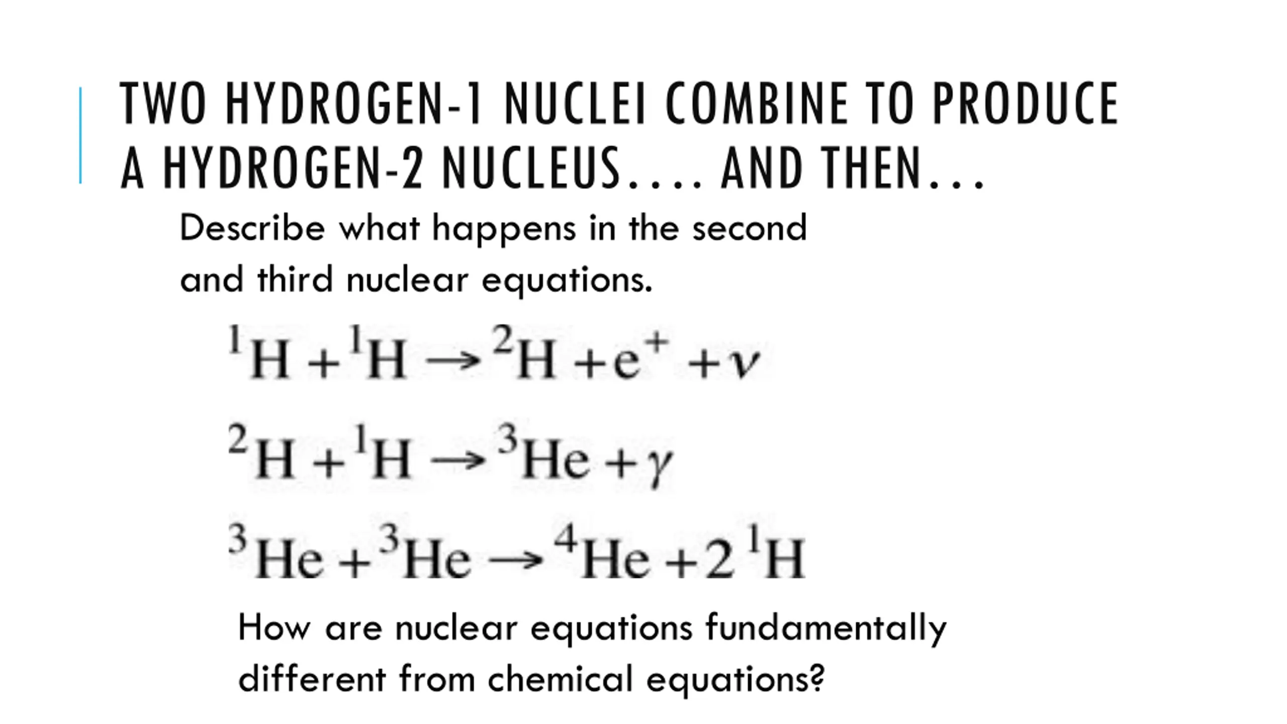 TWO HYDROGEN-1 NUCLEI COMBINE TO PRODUCE A HYDROGEN-2 NUCLEUS . AND THEN Describe what happens in the second and third nuclear equations. How are nuclear equations fundamentally different from chemical equations?