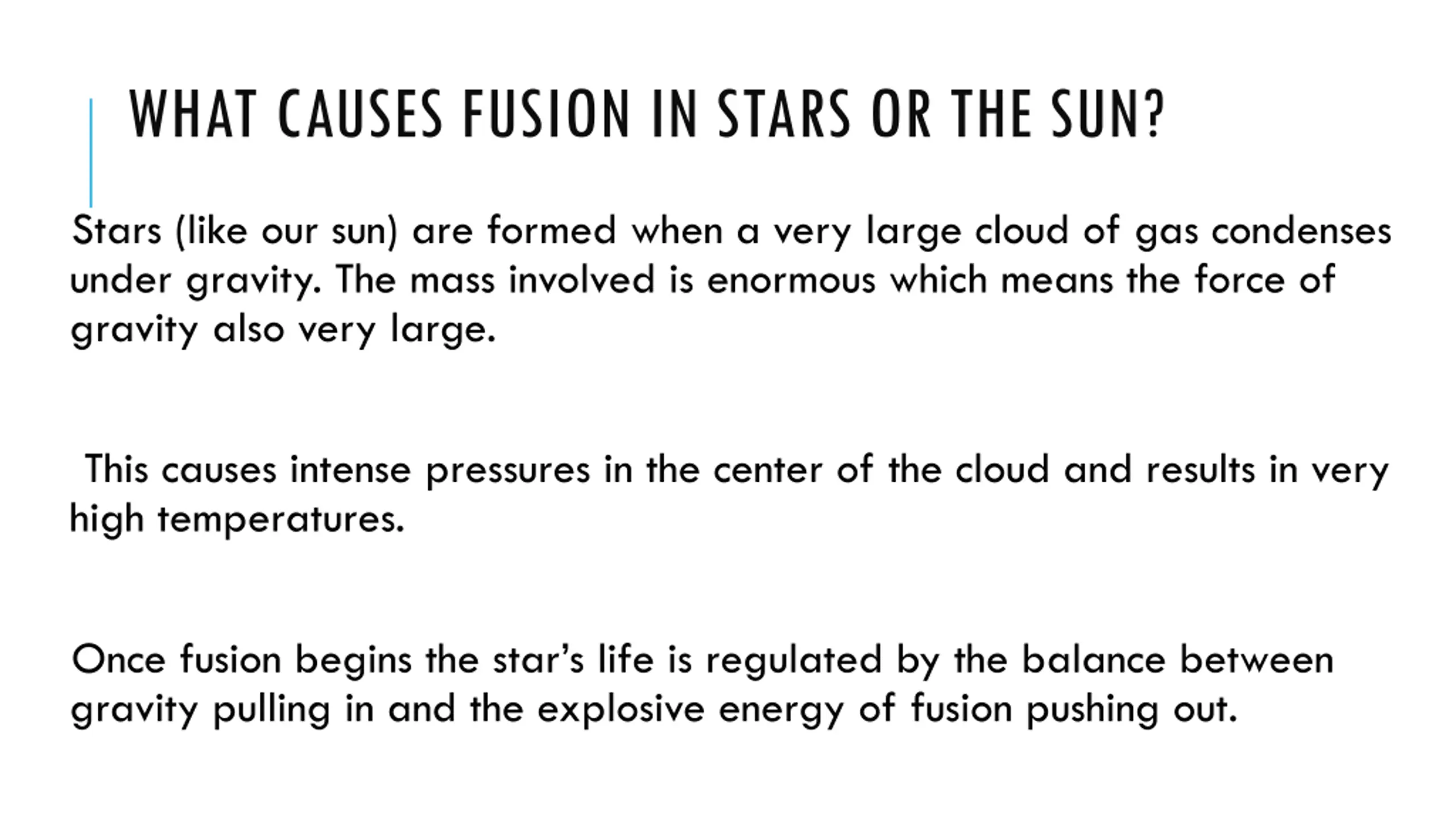WHAT CAUSES FUSION IN STARS OR THE SUN? Stars (like our sun) are formed when a very large cloud of gas condenses under gravity. The mass involved is enormous which means the force of gravity also very large. This causes intense pressures in the center of the cloud and results in very high temperatures. Once fusion begins the star s life is regulated by the balance between gravity pulling in and the explosive energy of fusion pushing out.