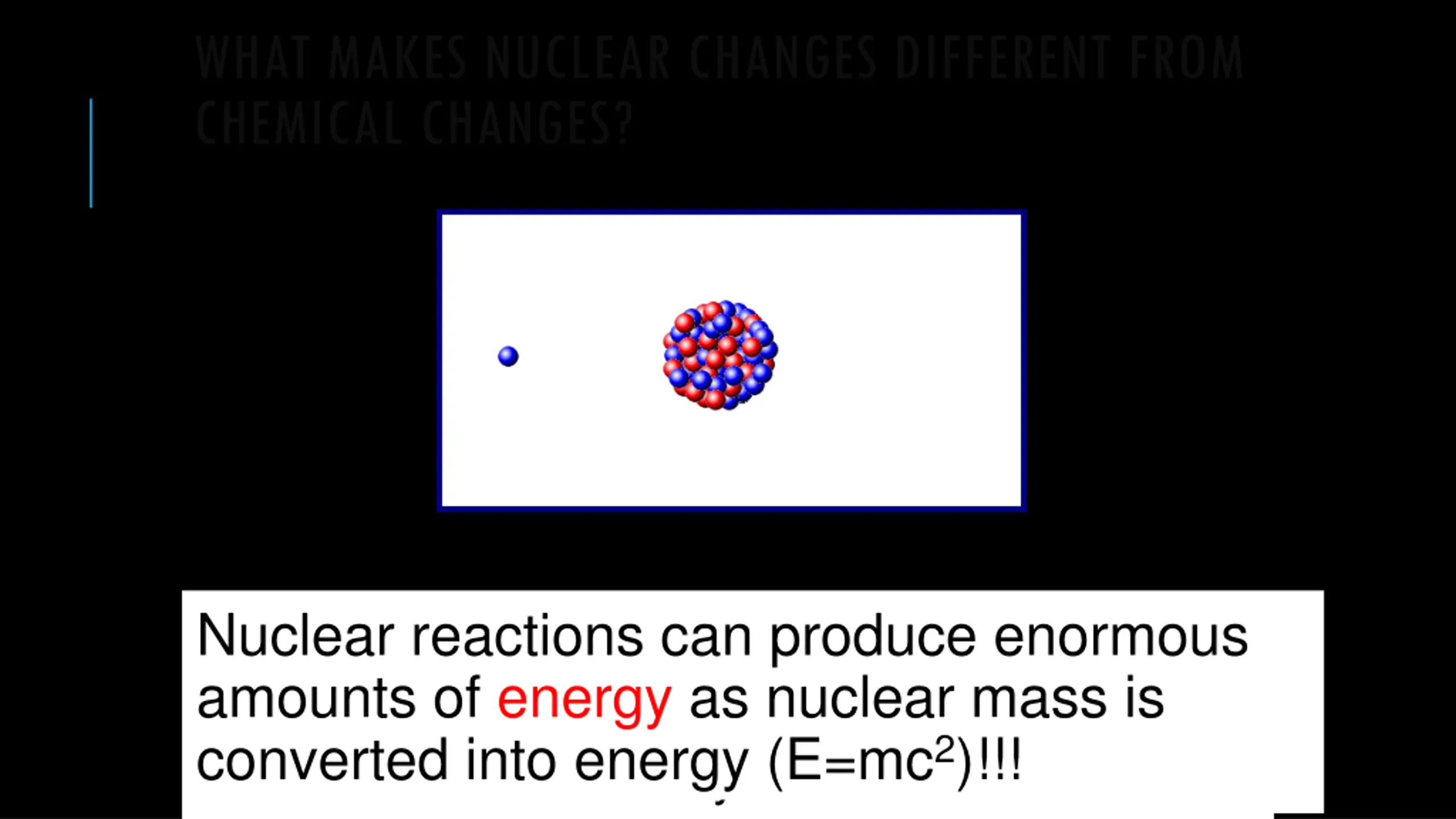What does the term Nuclear reaction make you think of? The Nucleus of the Atom!! What do you think reacts in a Nuclear Reaction? Protons and Neutrons! What reacts in a combustion reaction or other typical chemical reactions? Electrons! Which will generate MORE Energy: NUCLEAR REACTIONS!!!