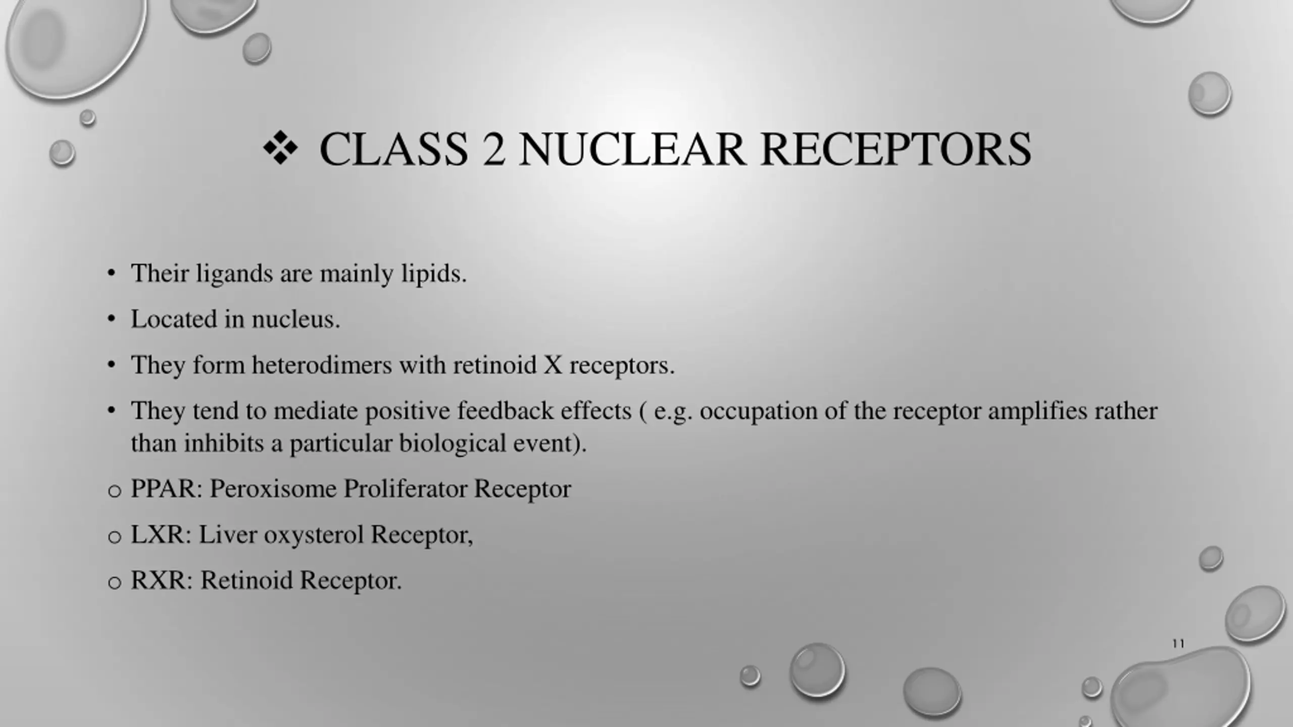 CLASS 2 NUCLEAR RECEPTORS Their ligands are mainly lipids. Located in nucleus. They form heterodimers with retinoid X receptors. They tend to mediate positive feedback effects ( e.g. occupation of the receptor amplifies rather than inhibits a particular biological event). o PPAR: Peroxisome Proliferator Receptor o LXR: Liver oxysterol Receptor, o RXR: Retinoid Receptor. 11