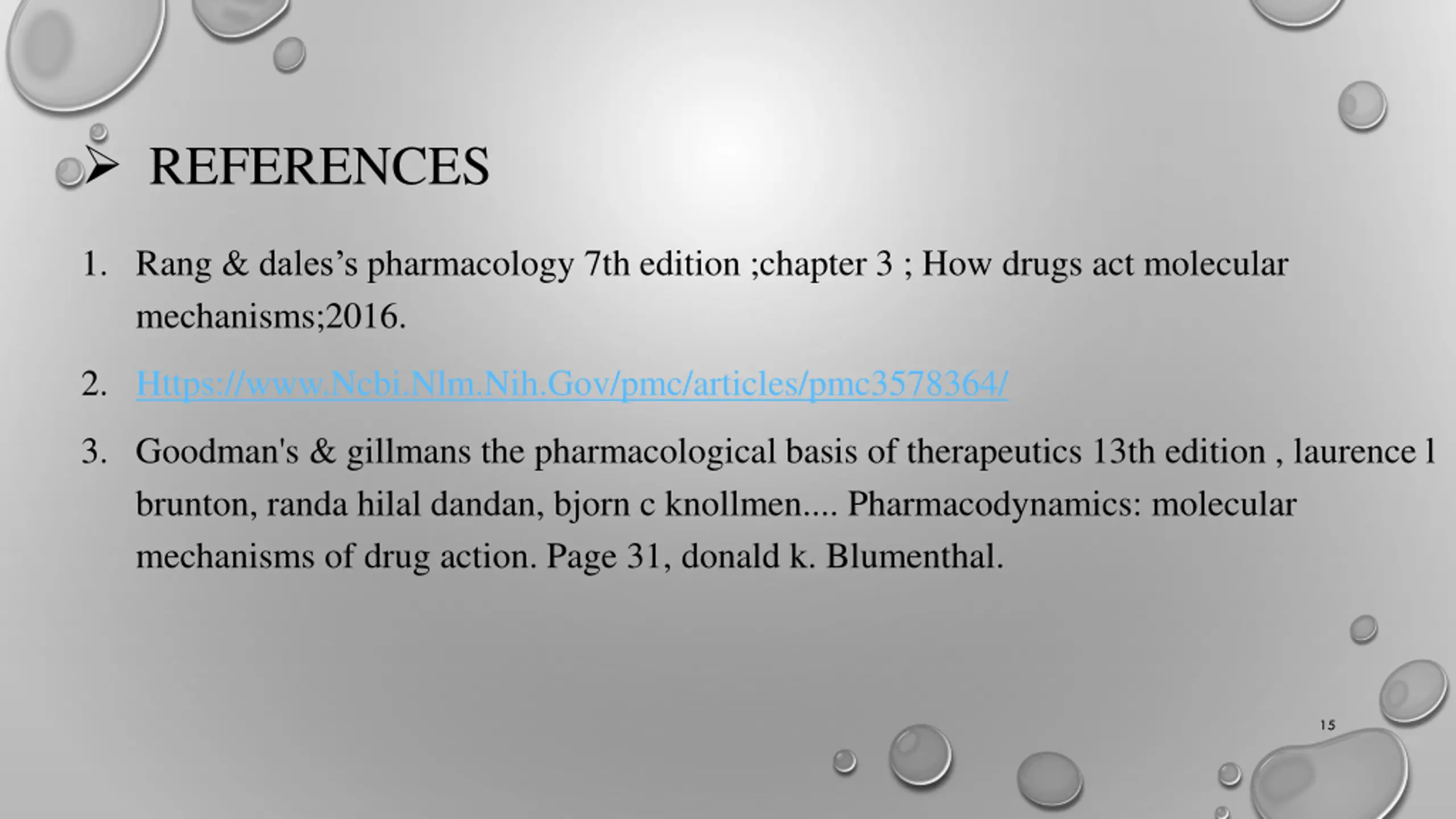 REFERENCES 1. Rang & dales s pharmacology 7th edition ;chapter 3 ; How drugs act molecular mechanisms;2016. 2. Https://www.Ncbi.Nlm.Nih.Gov/pmc/articles/pmc3578364/ 3. Goodman's & gillmans the pharmacological basis of therapeutics 13th edition , laurence l brunton, randa hilal dandan, bjorn c knollmen.... Pharmacodynamics: molecular mechanisms of drug action. Page 31, donald k. Blumenthal. 15