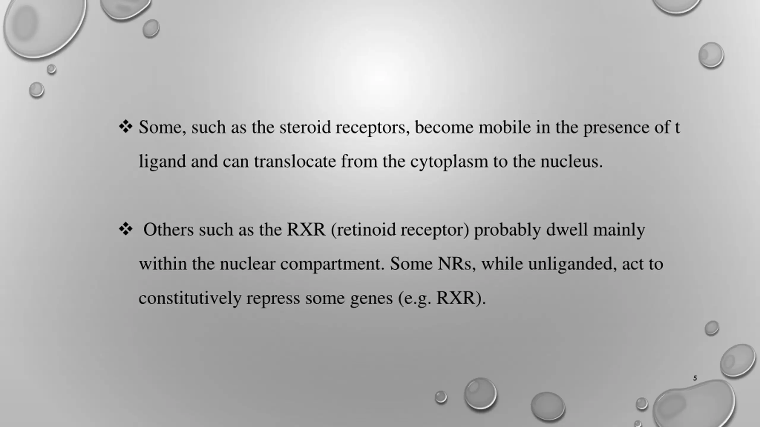 Some, such as the steroid receptors, become mobile in the presence of t ligand and can translocate from the cytoplasm to the nucleus. Others such as the RXR (retinoid receptor) probably dwell mainly within the nuclear compartment. Some NRs, while unliganded, act to constitutively repress some genes (e.g. RXR). 5