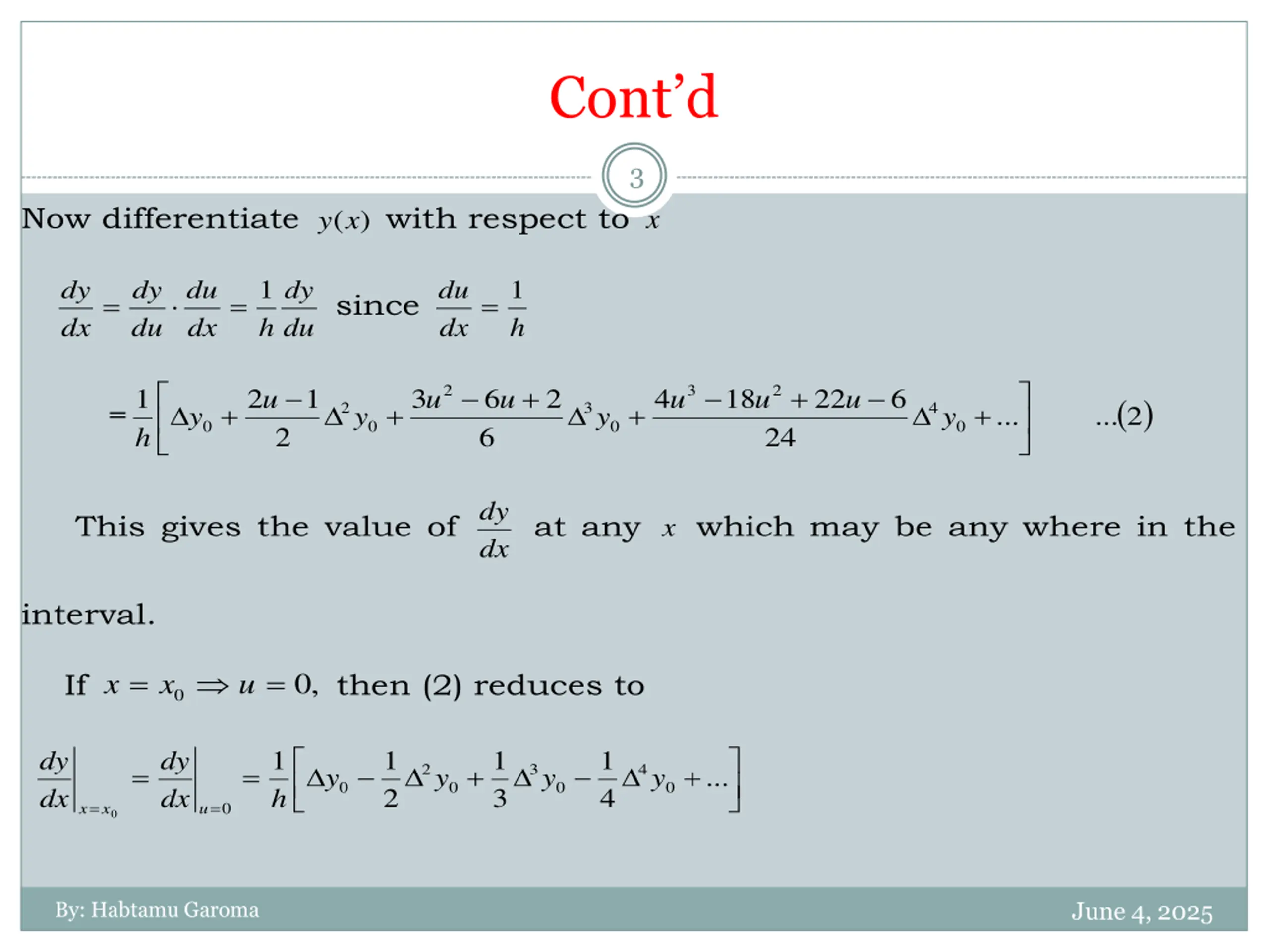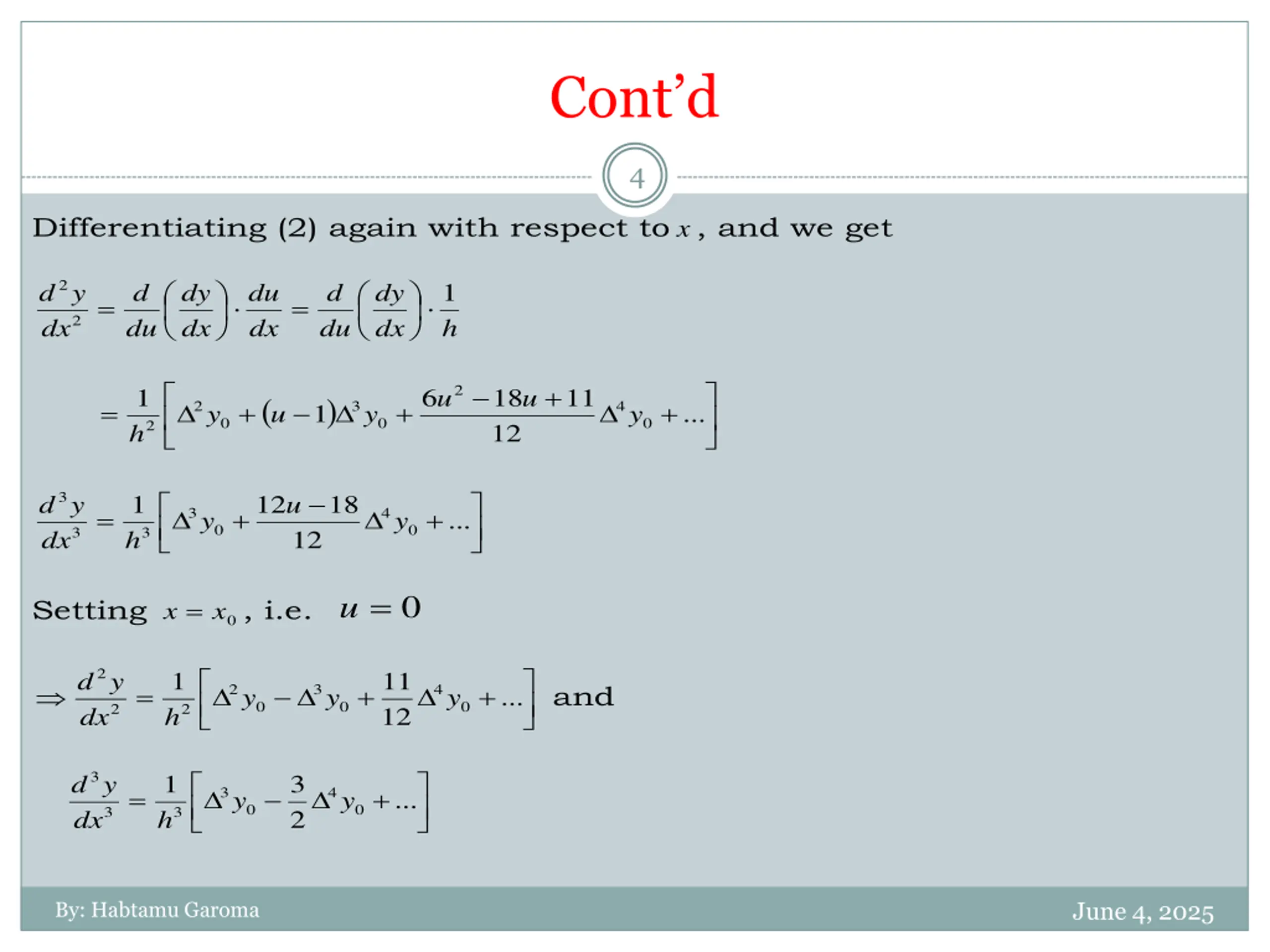 Contd 3 Now differentiate with respect to x (x ) y 1 1 dy dy du dy du since = = = dx du dx h du dx h + + 2 3 2 1 h 2 1 3 6 2 4 18 22 6 u u u u u u ( ) 2 + + + + = 2 3 4 ... ... y y y y 0 0 0 0 2 6 24 dy at any x which may be any where in the This gives the value of dx interval. = = , 0 x x u If then (2) reduces to 0 1 h 1 1 1 dy dy = = + + 2 3 4 ... y y y y 0 0 0 0 2 3 4 dx dx = = 0 x x u 0 June 4, 2025 By: Habtamu Garoma