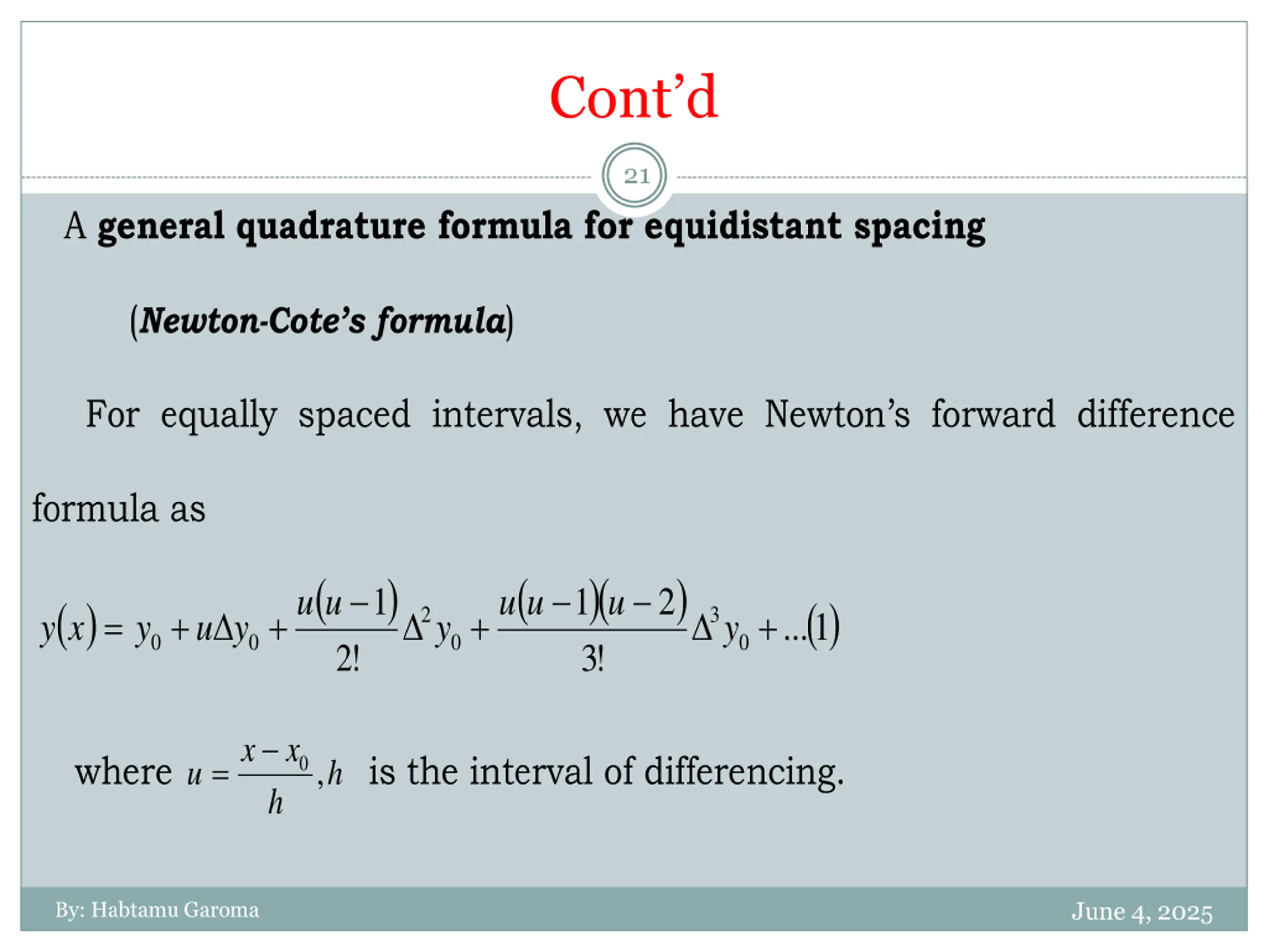 Contd 21 A general quadrature formula for equidistant spacing (Newton-Cote s formula) For equally spaced intervals, we have Newton s forward difference formula as ( ) ( )( ) 1 1 2 u u u u u ( ) x ( ) 1 = + + + + 2 3 ... y y u y y y 0 0 0 0 ! 2 ! 3 x x where is the interval of differencing. = 0 , u h h June 4, 2025 By: Habtamu Garoma