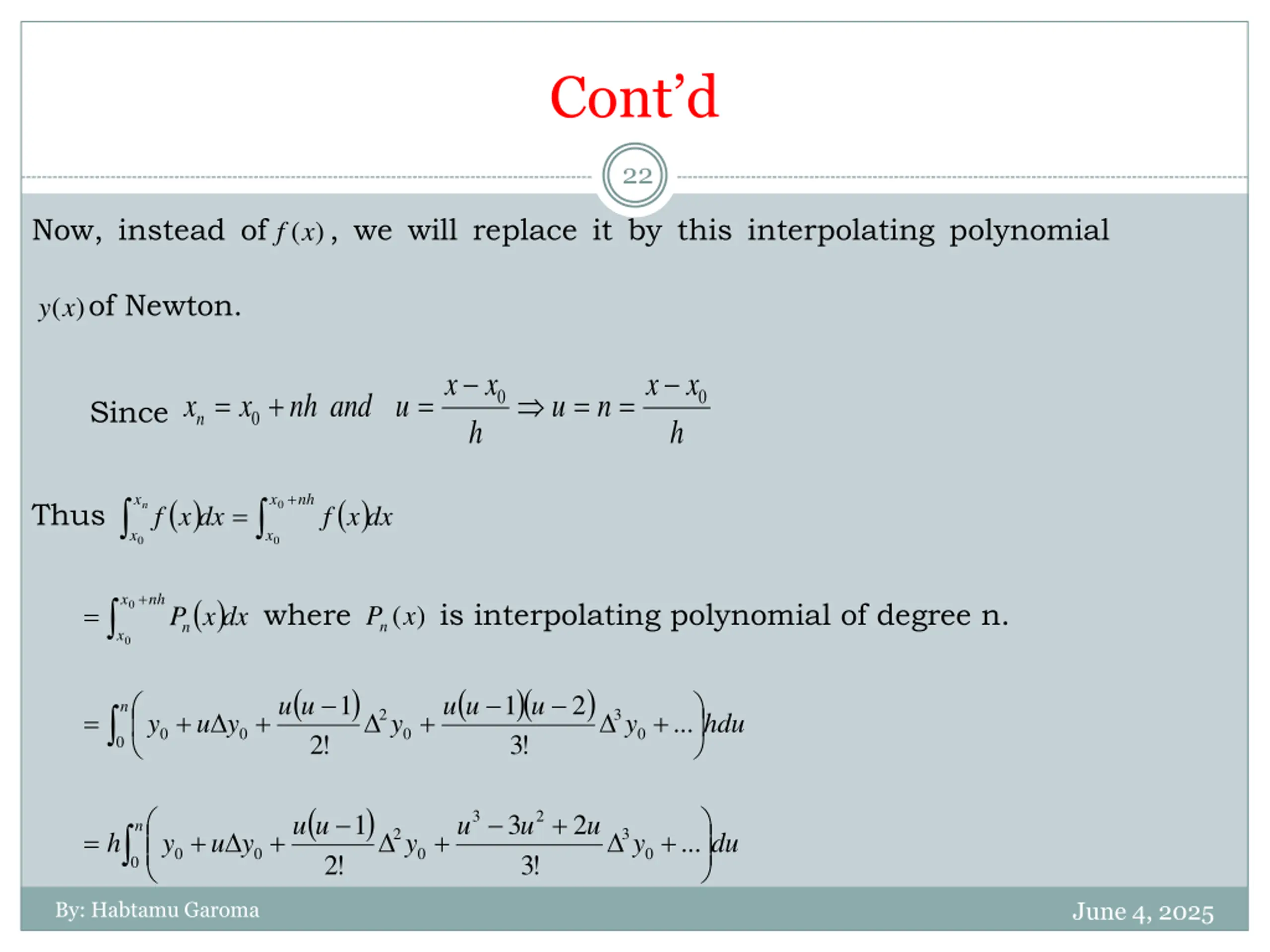 Contd 22 Now, instead of , we will replace it by this interpolating polynomial (x ) f of Newton. (x ) y x x x x = + = = = 0 0 xn x nh and u u n Since 0 h h + ( ) x ( )dx x x x nh Thus = 0 n f dx f x x 0 0 + ( )dx x x nh where is interpolating polynomial of degree n. = 0 (x ) Pn P n x 0 ( ) ( )( ) 1 1 2 u u ! 2 u u u n = + + + + 2 3 hdu ... y u y y y 0 0 0 0 ! 3 0 ( ) + 3 2 1 3 2 u u ! 2 u u ! 3 u n 0 du = + + + + 2 3 ... h y u y y y 0 0 0 0 June 4, 2025 By: Habtamu Garoma