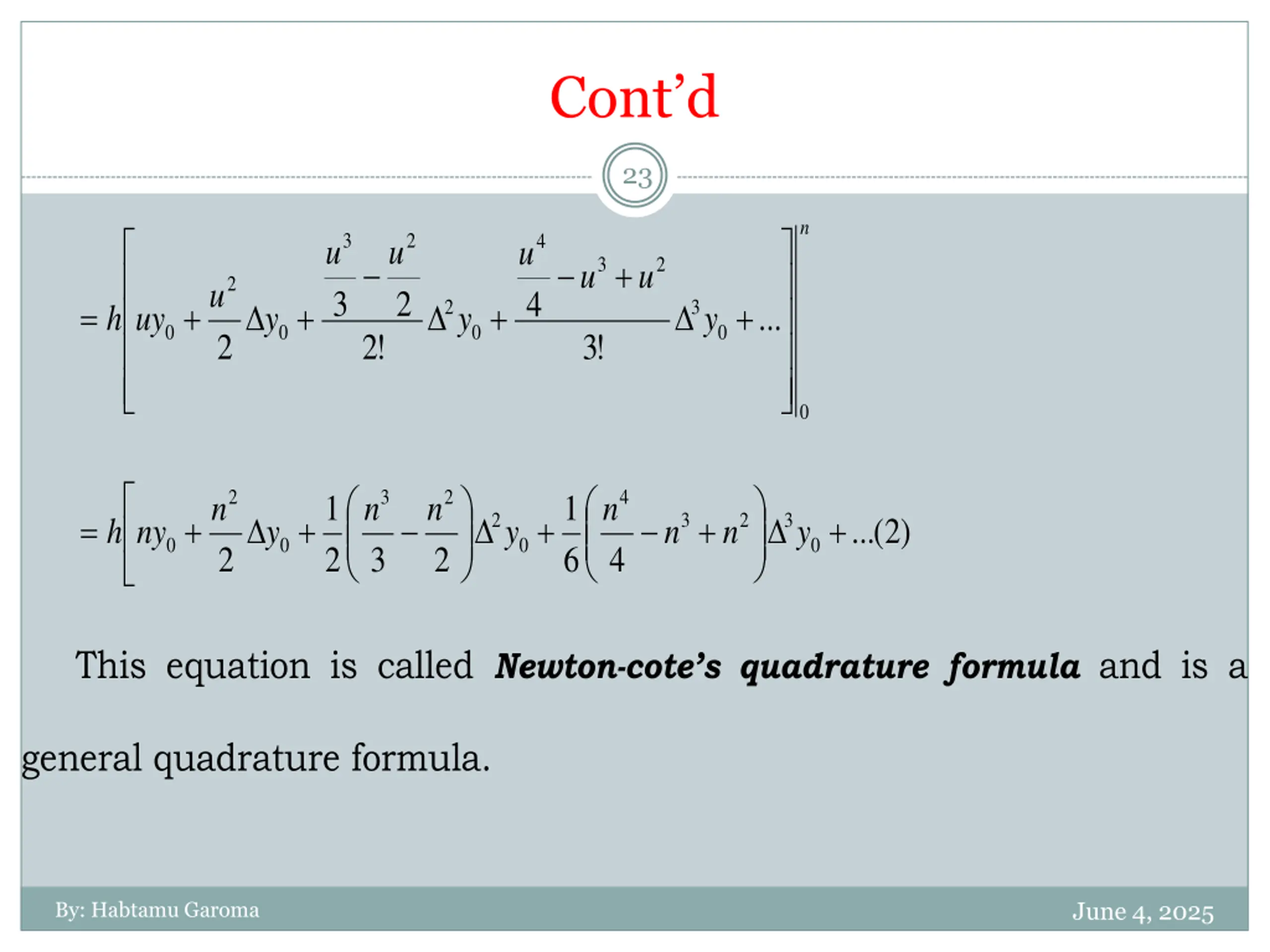 Contd 23 n 3 2 4 u 3 u 2 u 4 + 3 2 u u 2 u 2 = + + + + 2 3 ... h uy y y y 0 0 0 0 ! 2 ! 3 0 2 3 2 4 1 1 n n n n = + + + + + 2 3 2 3 ) 2 ( ... h ny y y n n y 0 0 0 0 2 2 3 2 6 4 This equation is called Newton-cote s quadrature formula and is a general quadrature formula. June 4, 2025 By: Habtamu Garoma