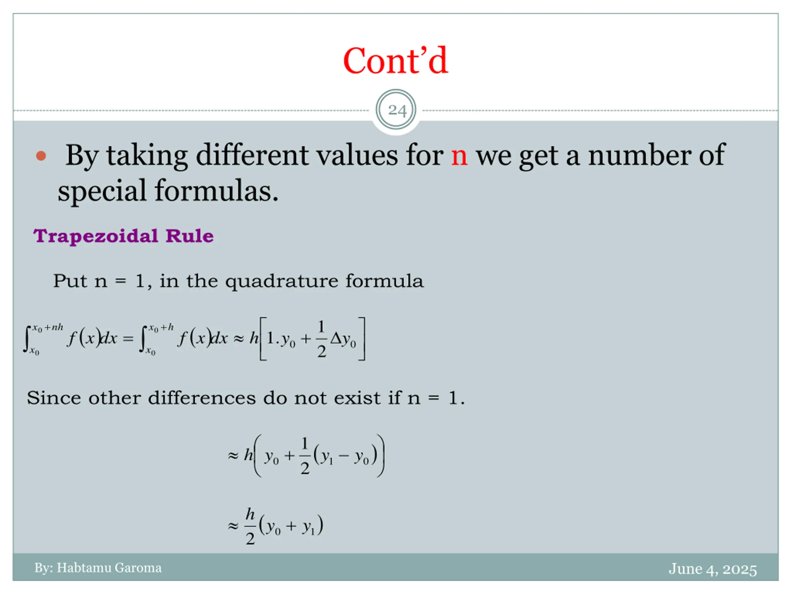 Contd 24 By taking different values for n we get a number of special formulas. Trapezoidal Rule Put n = 1, in the quadrature formula . 1 1 + + ( ) x ( ) x x nh x h = + 0 0 f dx f dx h y y 0 0 2 x x 0 0 Since other differences do not exist if n = 1. 1 ( ) + h y y y 0 1 0 2 h ( ) + y y 0 1 2 June 4, 2025 By: Habtamu Garoma