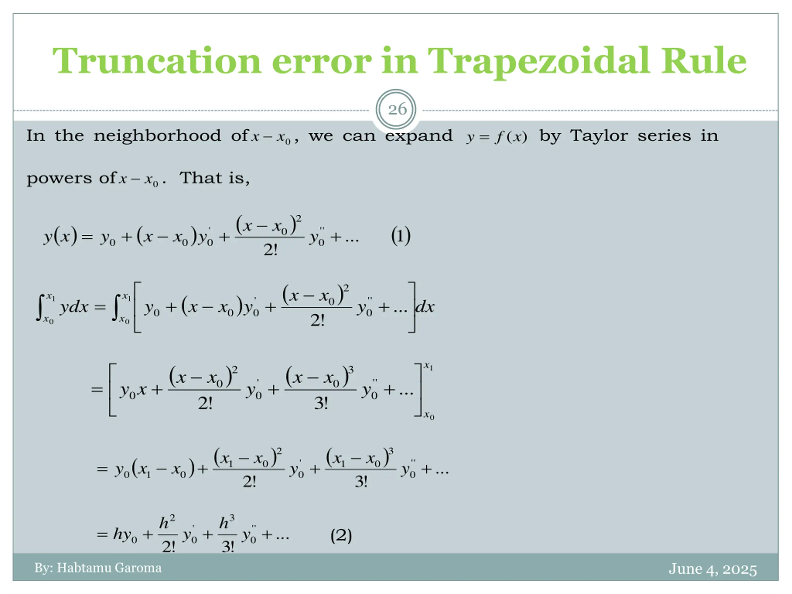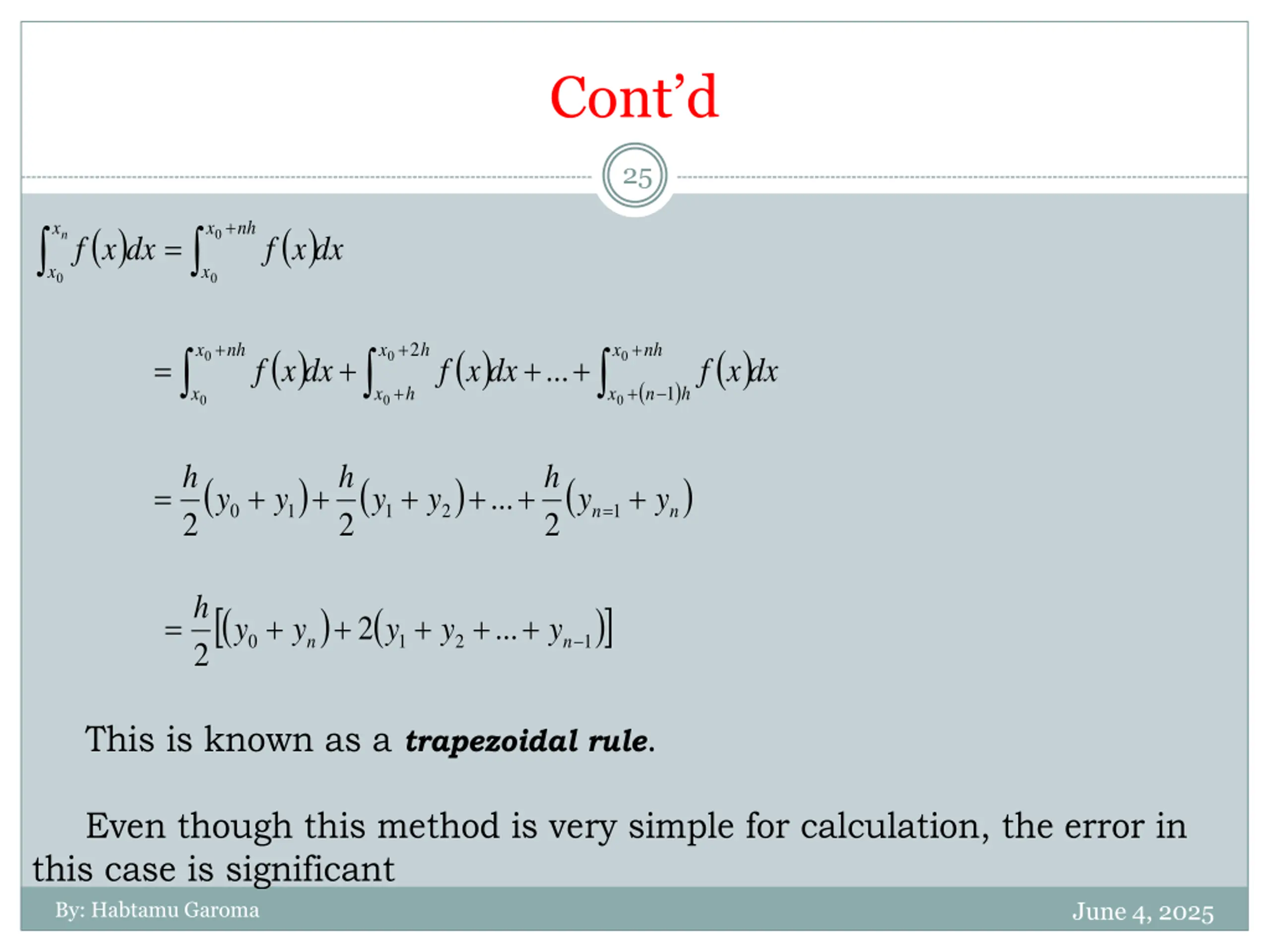 Contd 25 + ( ) x ( )dx x n x x nh = 0 f dx f x x 0 0 + + + ( ) x ( ) x ( ) x 2 x nh x h x nh = + + + 0 0 0 ... f dx f dx f dx ( ) + + 1 x x h x n h 0 0 0 h 2 h 2 h 2 ( ) ( ) ( ) = + + + + + + ... y y y y y y =1 0 1 1 2 n n h ( ) ( ) = + + + + + 2 ... y y y y y 0 1 2 1 n n 2 This is known as a trapezoidal rule. Even though this method is very simple for calculation, the error in this case is significant June 4, 2025 By: Habtamu Garoma
