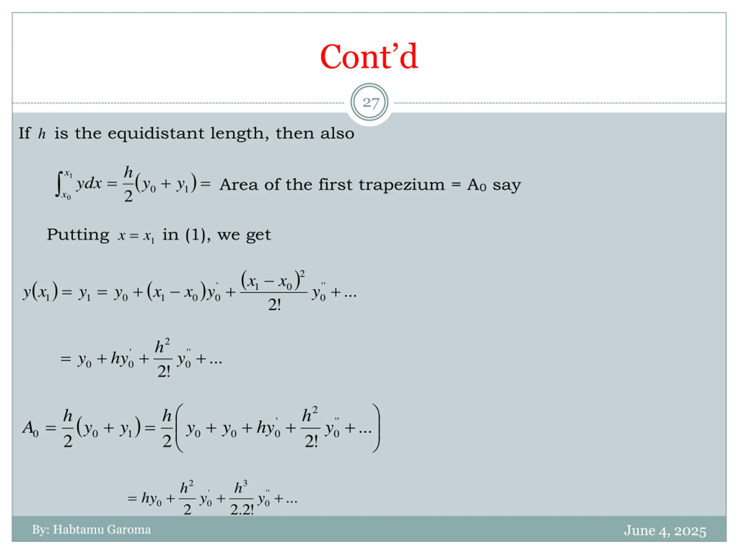 Contd 27 If h is the equidistant length, then also h ( ) = x = + 1 ydx y y Area of the first trapezium = A0 say 0 1 2 x 0 x = Putting in (1), we get 1x ( ) 2 x x ( ) x ( ) = = + + + ' ' ' 0 1 0 ... y y y x x y y 1 1 0 1 0 0 ! 2 2 h = + + + ' ' ' 0 ... y hy y 0 0 ! 2 2 h h h ( ) = + = + + + + ' ' ' 0 ... A y y y y hy y 0 0 1 0 0 0 2 2 ! 2 2 3 h h = + + + ' ' ' 0 ... hy y y 0 0 2 ! 2 . 2 June 4, 2025 By: Habtamu Garoma