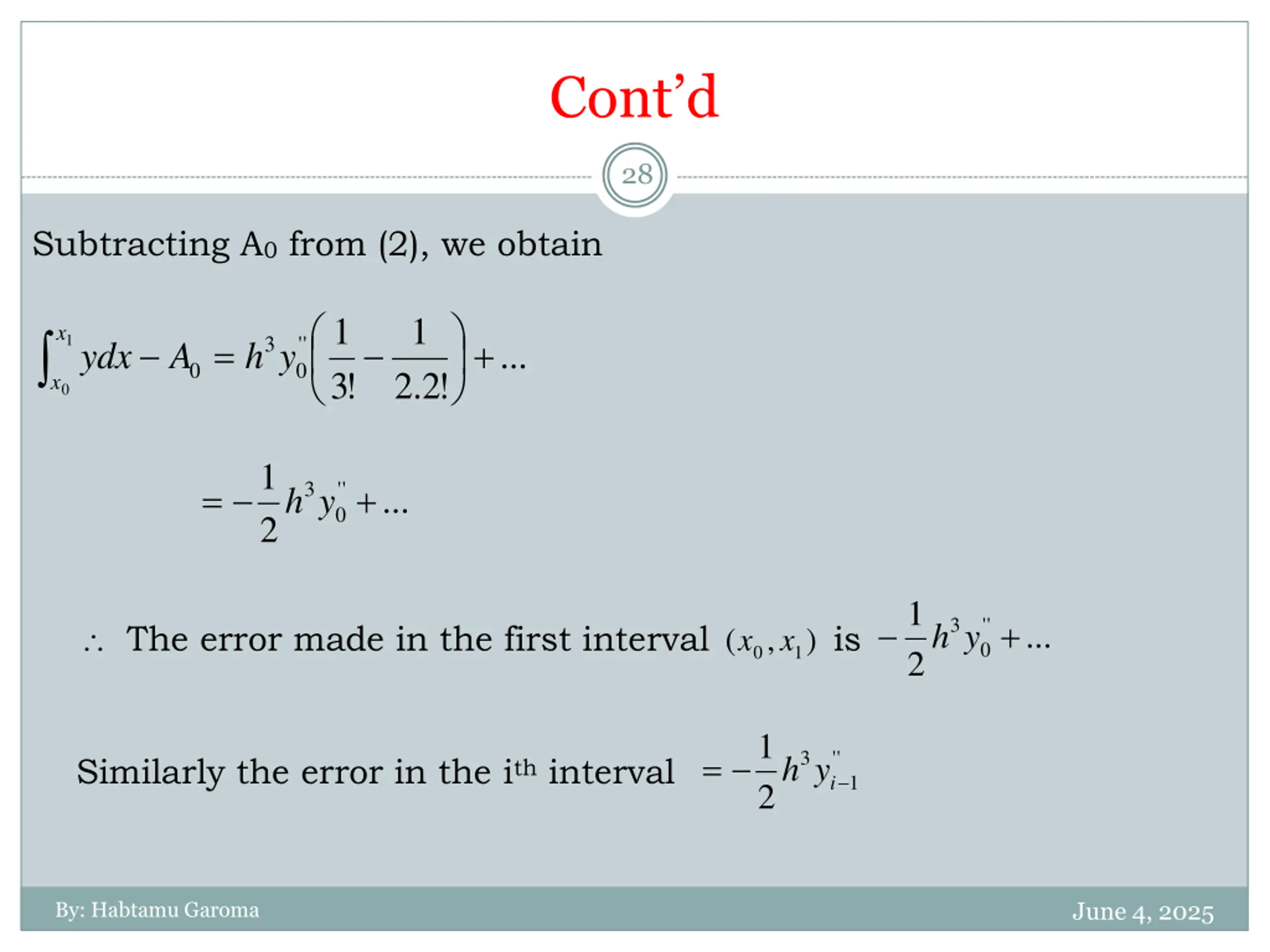Contd 28 Subtracting A0 from (2), we obtain 1 1 x = + 1 3 ' ' 0 ... ydx A h y 0 ! 3 ! 2 . 2 x 0 1 = + 3 ' ' 0 ... h y 2 1 + 3 ' ' 0 ... h y The error made in the first interval is ( , ) x 0x 1 2 1 = 3 ' ' h iy Similarly the error in the ith interval 1 2 June 4, 2025 By: Habtamu Garoma
