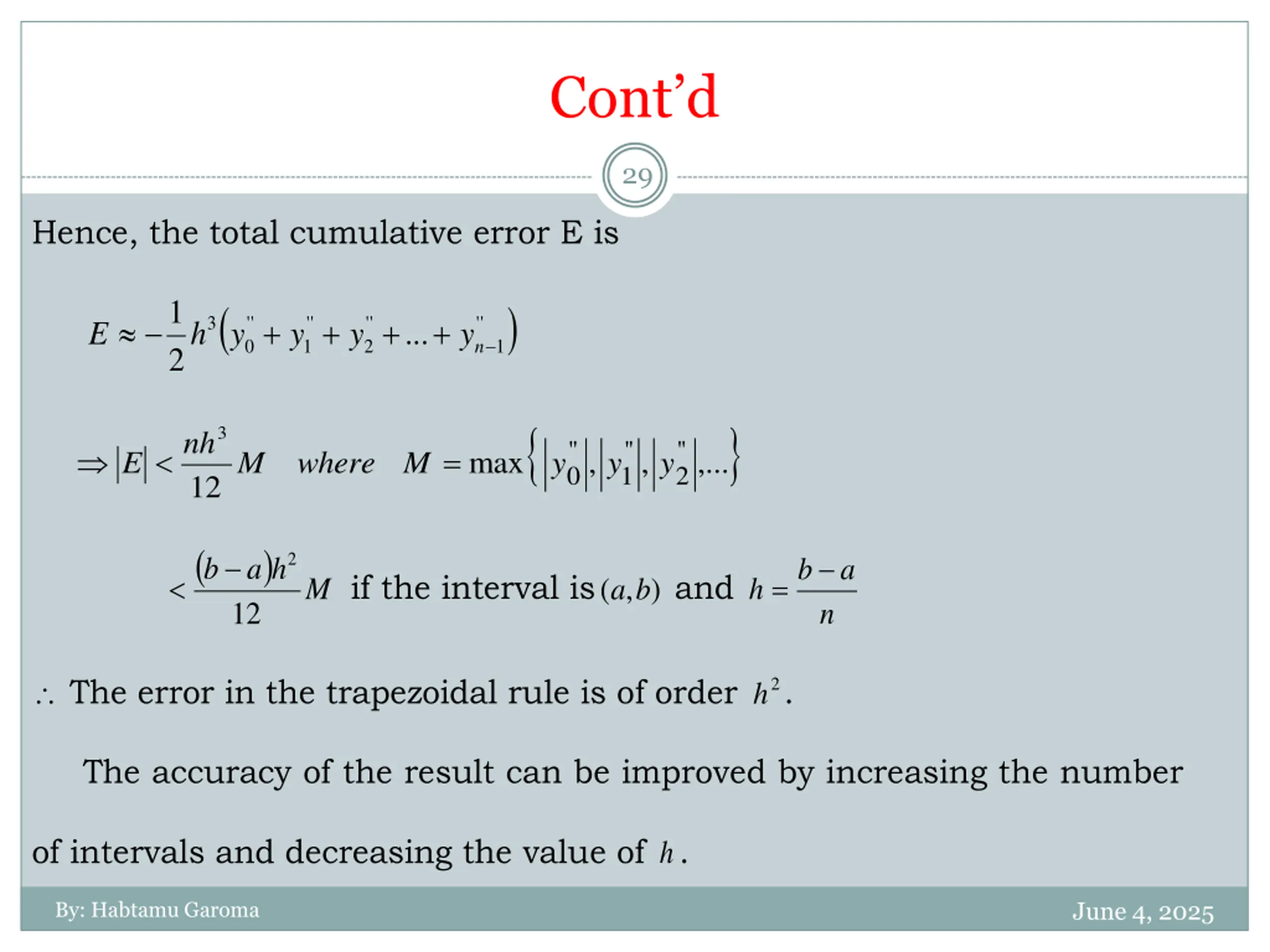 Contd 29 Hence, the total cumulative error E is ( ) 1 + + + + 3 ' ' 0 ' ' 1 ' ' 2 ' ' ... E h y y y ny 1 2 3 nh ' ' 0 ' ' 1 ' ' 2 = max , , ,... E M where M y y y 12 ( ) 2 b a h b a if the interval is and = M ( b a , ) h 12 n The error in the trapezoidal rule is of order h . 2 The accuracy of the result can be improved by increasing the number of intervals and decreasing the value of h. June 4, 2025 By: Habtamu Garoma