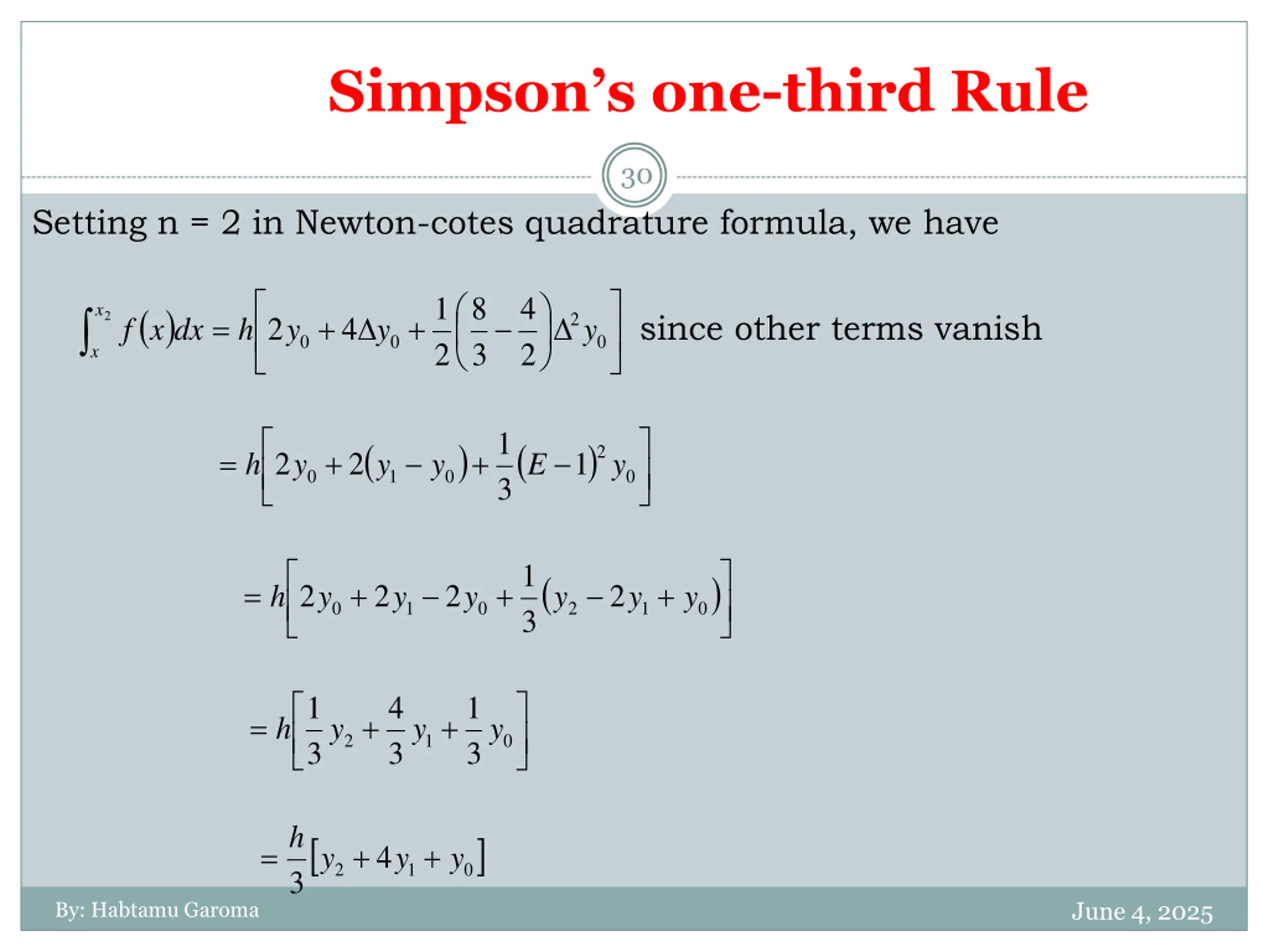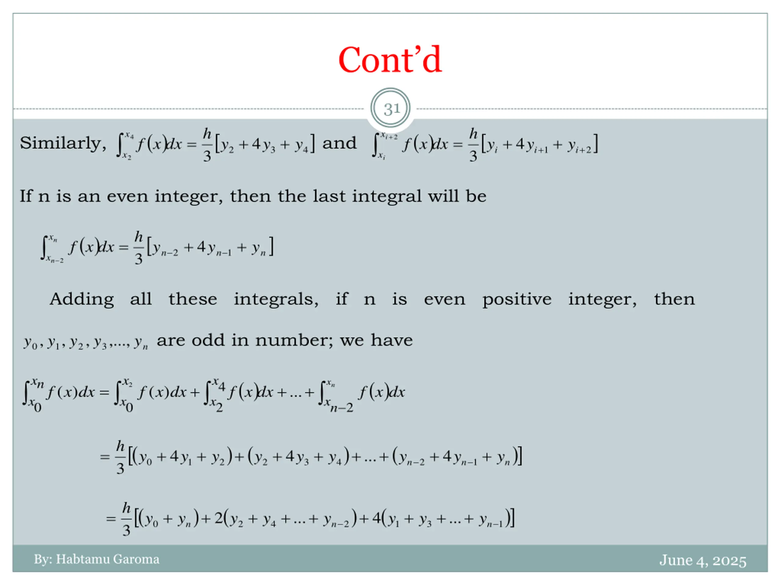 Simpsons one-third Rule 30 Setting n = 2 in Newton-cotes quadrature formula, we have 1 8 4 ( ) x x since other terms vanish = + + 2 2 2 4 f dx h y y y 0 0 0 2 3 2 x 1 ( ) ( ) 2 = + + 2 2 1 h y y y E y 0 1 0 0 3 1 ( ) = + + + 2 2 2 2 h y y y y y y 0 1 0 2 1 0 3 1 4 1 = + + h y y y 2 1 0 3 3 3 h = + + 4 y y y 2 1 0 3 June 4, 2025 By: Habtamu Garoma