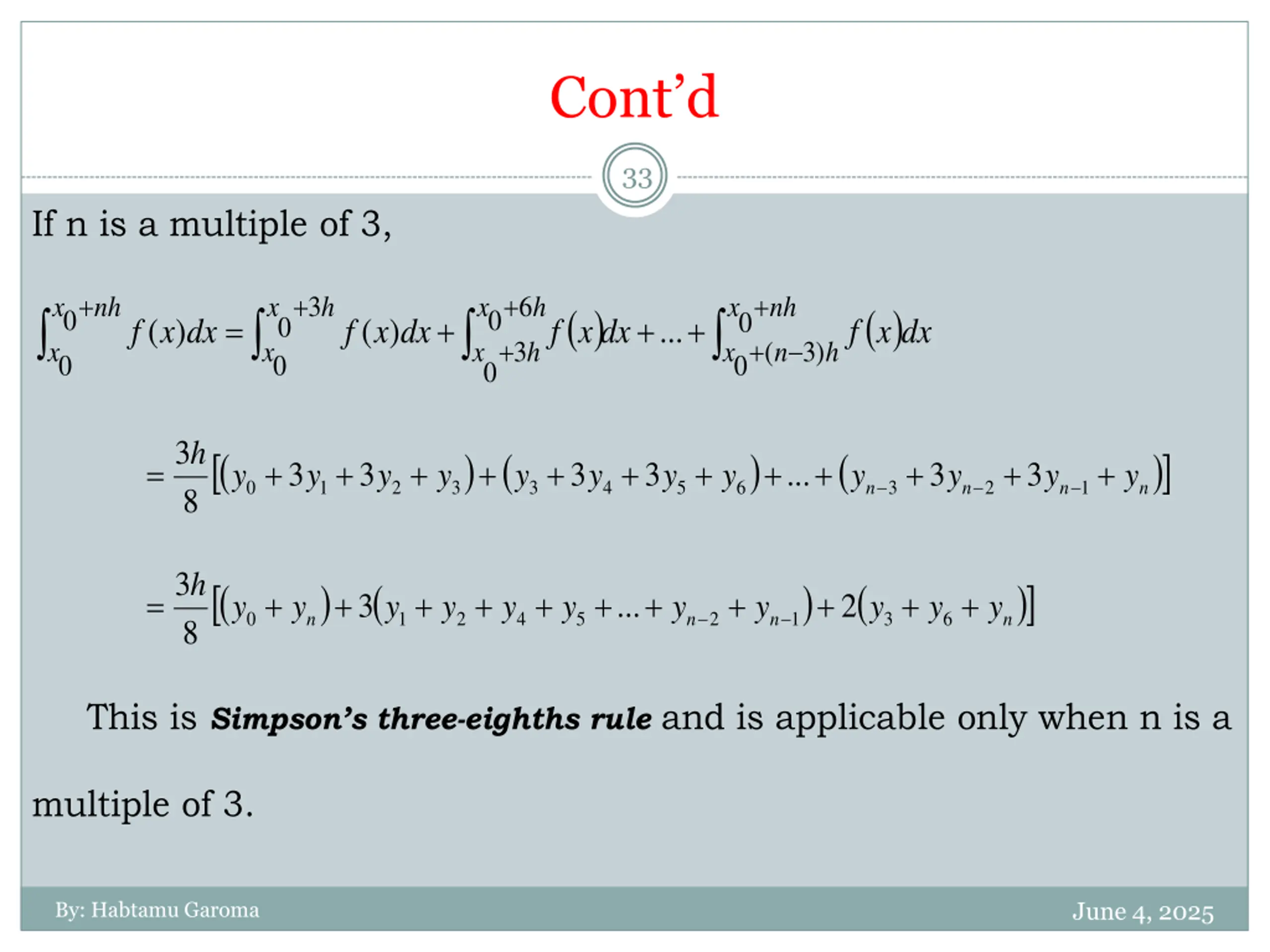Contd 33 If n is a multiple of 3, + + + + + + 3 6 3 x x nh x x h x x h h x x nh n ( ( ) x ( ) x 0 0 0 0 0 = + + + 0 0 ( ) ( ) ... f x dx f x dx f dx f dx ) 3 h 0 3 h 8 ( ) ( + ) ( ) = + + + + + + + + + + + 3 3 3 3 ... 3 3 y y y y y y y y y y y y 0 1 2 3 3 4 5 6 3 2 1 n n n n 3 h 8 ( ) ( ) ( ) = + + + + + + + + + + + 3 ... 2 y y y y y y y y y y y 0 1 2 4 5 2 1 3 6 n n n n This is Simpson s three-eighths rule and is applicable only when n is a multiple of 3. June 4, 2025 By: Habtamu Garoma