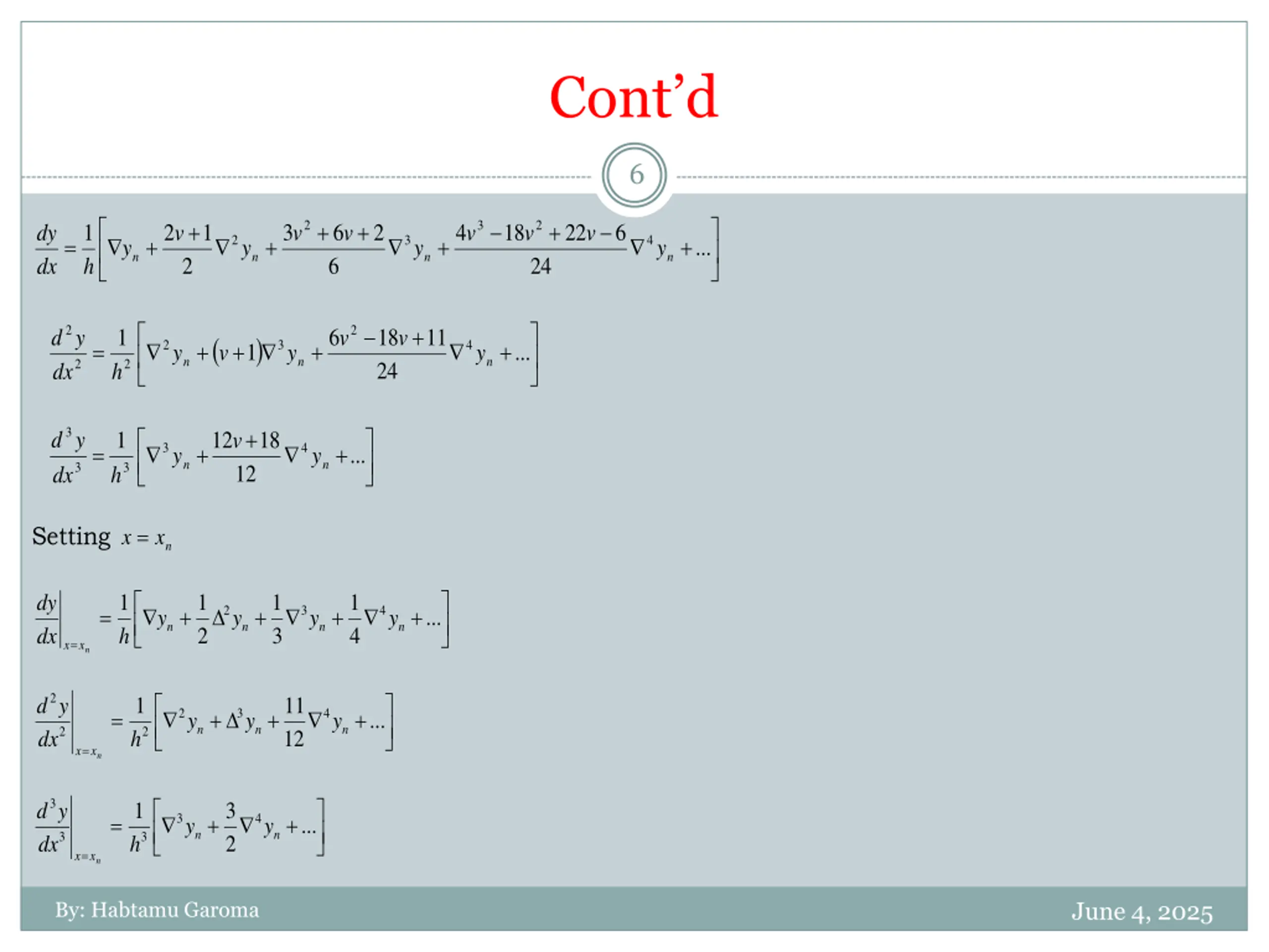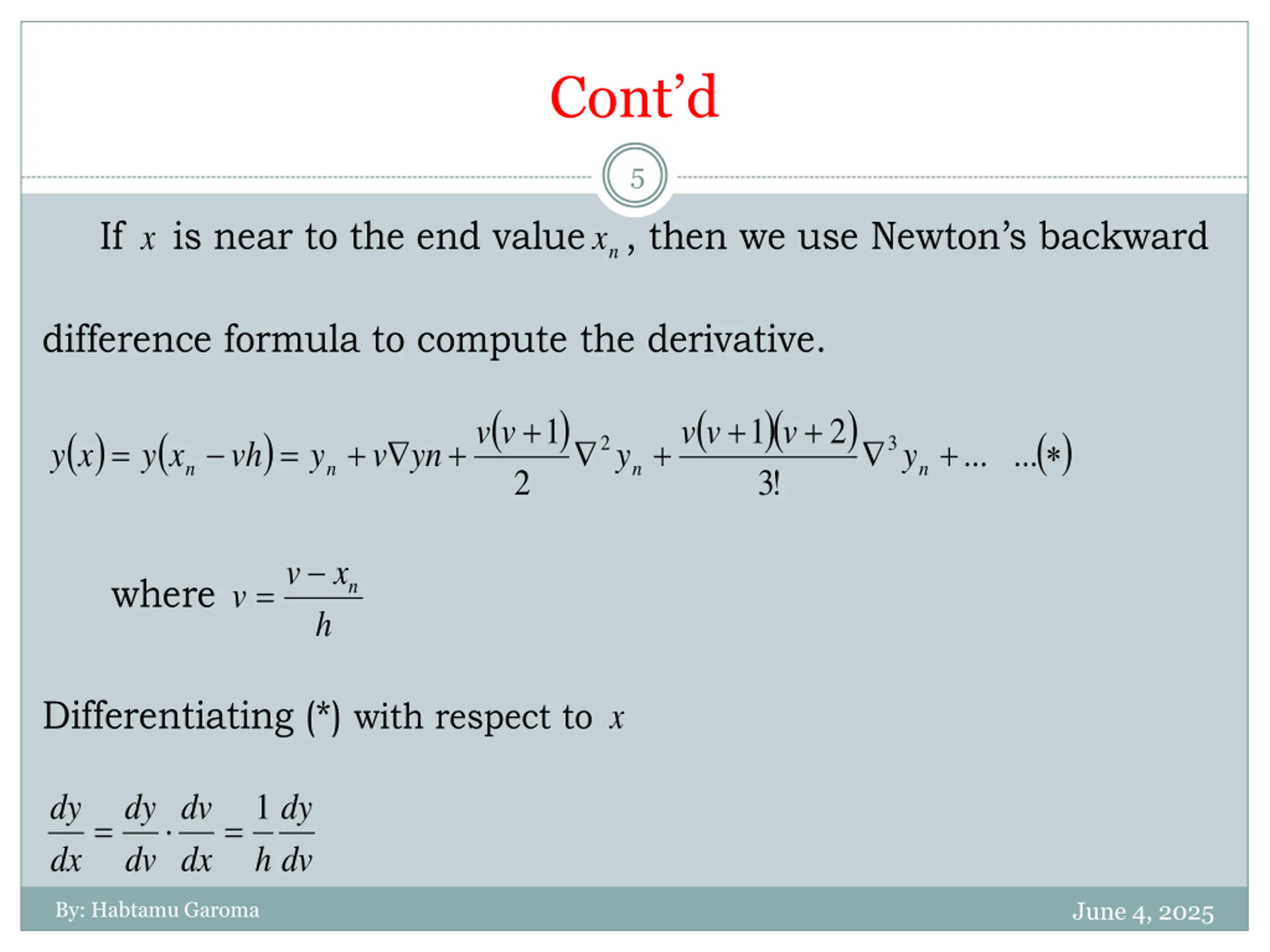 Contd 5 If x is near to the end value nx , then we use Newton s backward difference formula to compute the derivative. ( ) ( )( ) + 2 + + 1 1 2 v v v v v ( ) x ( ) ( ) = = + + + + 2 3 ... ... y y x vh y v yn y y n n n n ! 3 v x where = n v h Differentiating (*) with respect to x 1 dy dy dv dy = = dx dv dx h dv June 4, 2025 By: Habtamu Garoma