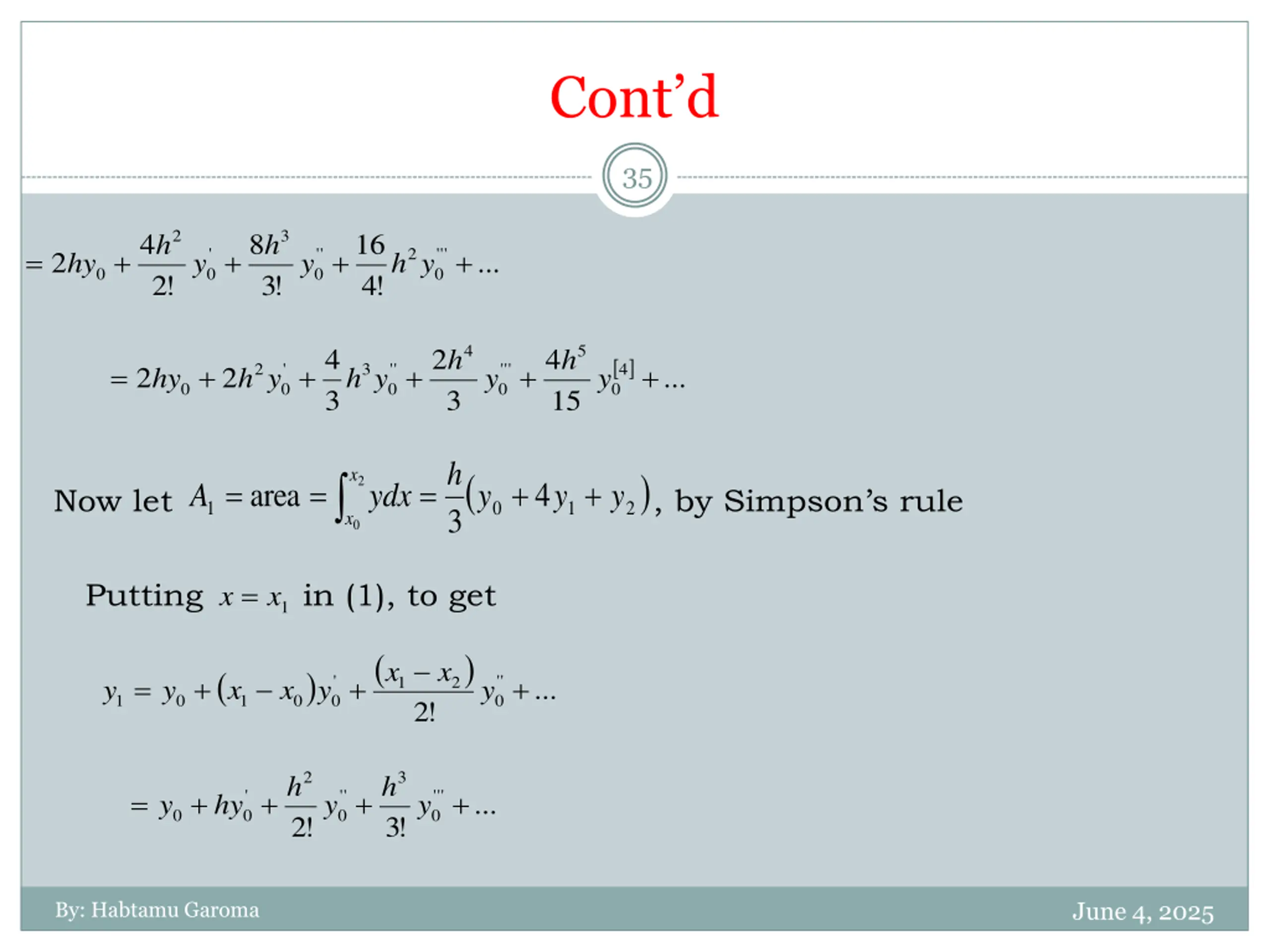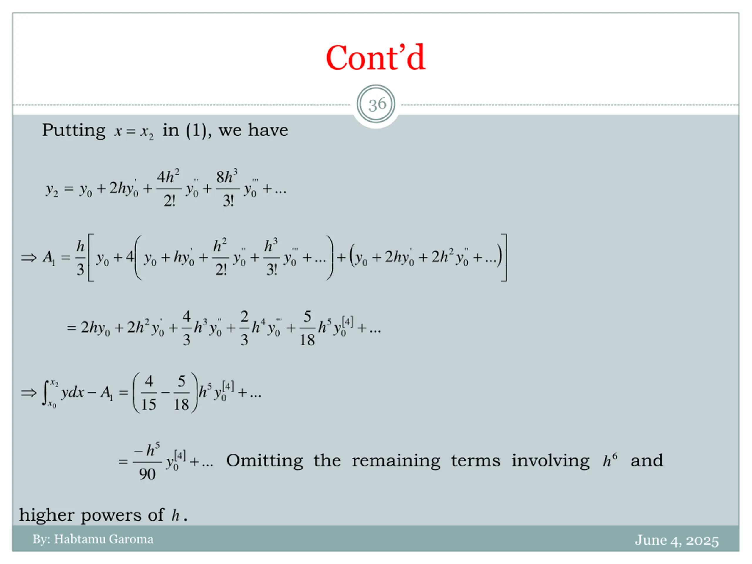 Contd 35 2 3 4 8 16 h h = + + + + ' ' ' 0 2 ' ' ' 0 2 ... hy y y h y 0 0 ! 2 ! 3 ! 4 4 5 4 2 4 h h 4 0 = + + + + + 2 ' 3 ' ' 0 ' ' ' 0 2 2 ... hy h y h y y y 0 0 3 3 15 h ( ) x = = = + + 2 area 4 A ydx y y y Now let , by Simpson s rule 1 0 1 2 3 x 0 x = Putting in (1), to get 1x ( ) x x ( ) = + + + ' ' ' 0 1 2 ... y y x x y y 1 0 1 0 0 ! 2 2 3 h h = + + + + ' ' ' 0 ' ' ' 0 ... y hy y y 0 0 ! 2 ! 3 June 4, 2025 By: Habtamu Garoma