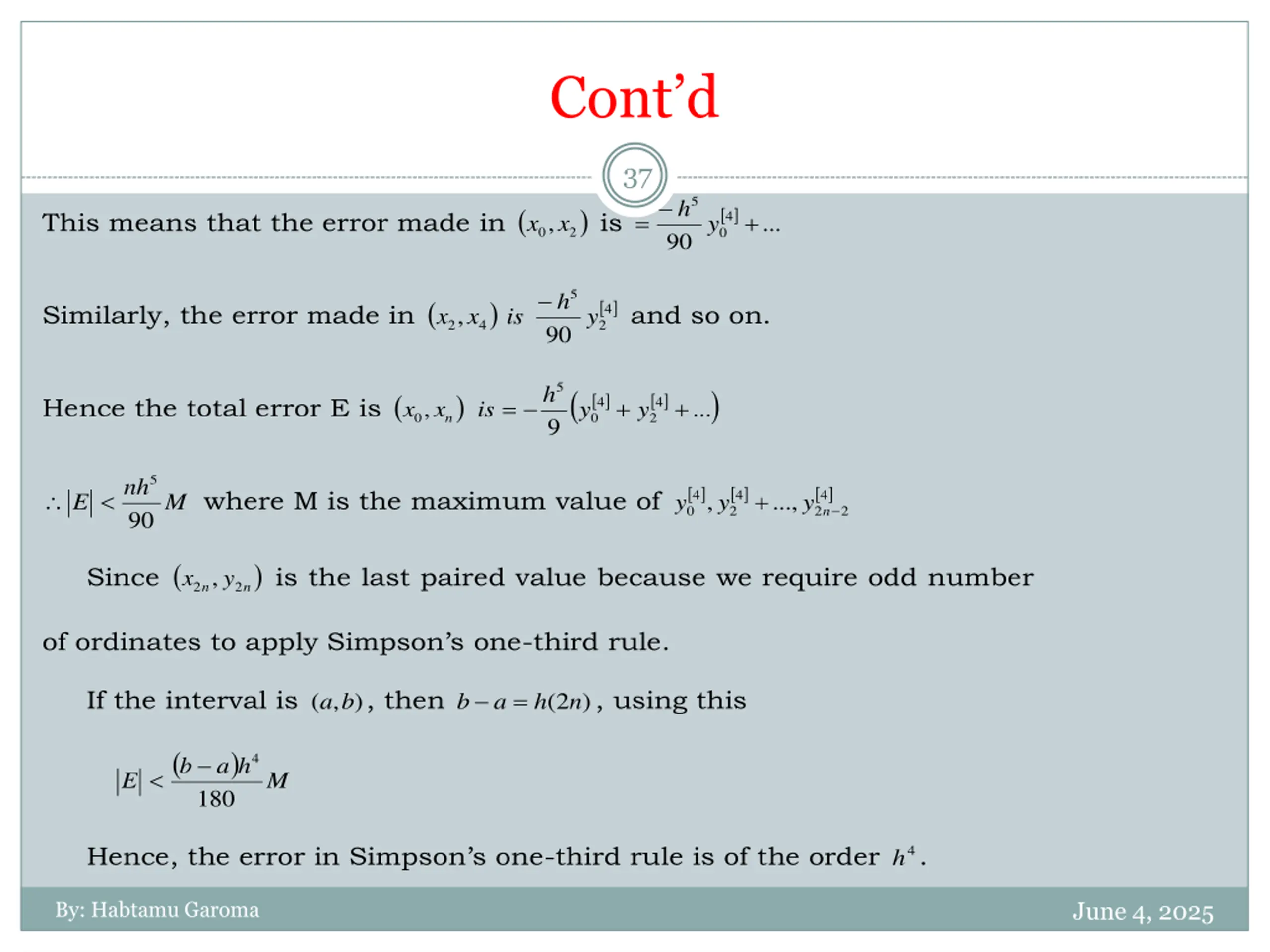 Contd 37 5 h This means that the error made in ( ) 4 0 is = + 0,x x ... y 2 90 5 h Similarly, the error made in ( ) 4 2 and so on. , x x is y 2 4 90 5 ( ) h Hence the total error E is ( ) 4 0 4 2 = + + , ... x x is y y 0 n 9 5 nh 90 4 0 4 2 4 2 n where M is the maximum value of + E M , ..., y y y 2 Since ( ) is the last paired value because we require odd number 2, x ny 2 n of ordinates to apply Simpson s one-third rule. If the interval is , then , using this = ( n 2 ) ( , ) a b b a h ( ) 4 b a h E M 180 Hence, the error in Simpson s one-third rule is of the order h . 4 June 4, 2025 By: Habtamu Garoma