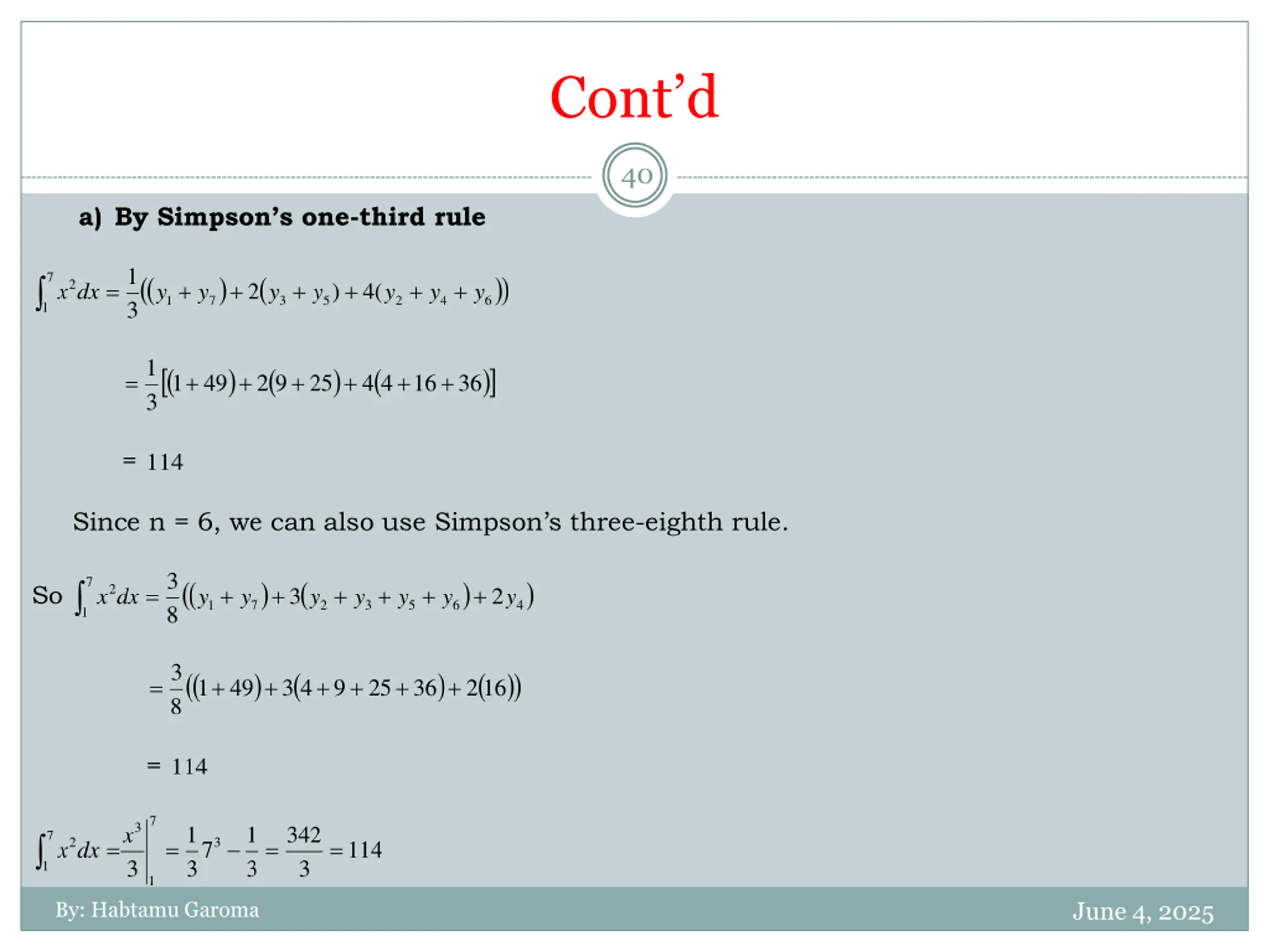 Contd 40 a)By Simpson s one-third rule 1 ( ( ) ( ) ) 7 = + + + + + + 2 2 ) ( 4 x dx y y y y y y y 1 7 3 5 2 4 6 3 1 1 ( ) ( ) ( ) = + + + + + + 1 49 2 9 25 4 4 16 36 3 = 114 Since n = 6, we can also use Simpson s three-eighth rule. 3 ( ( ) ( ) ) 7 So = + + + + + + 2 3 2 x dx y y y y y y y 1 7 2 3 5 6 4 8 1 3 ( ( ) ( ) ( ) 16 2 ) = + + + + + + 1 49 3 4 9 25 36 8 = 114 7 3 1 1 342 x 7 = = = = 2 3 7 114 x dx 3 3 3 3 1 1 June 4, 2025 By: Habtamu Garoma
