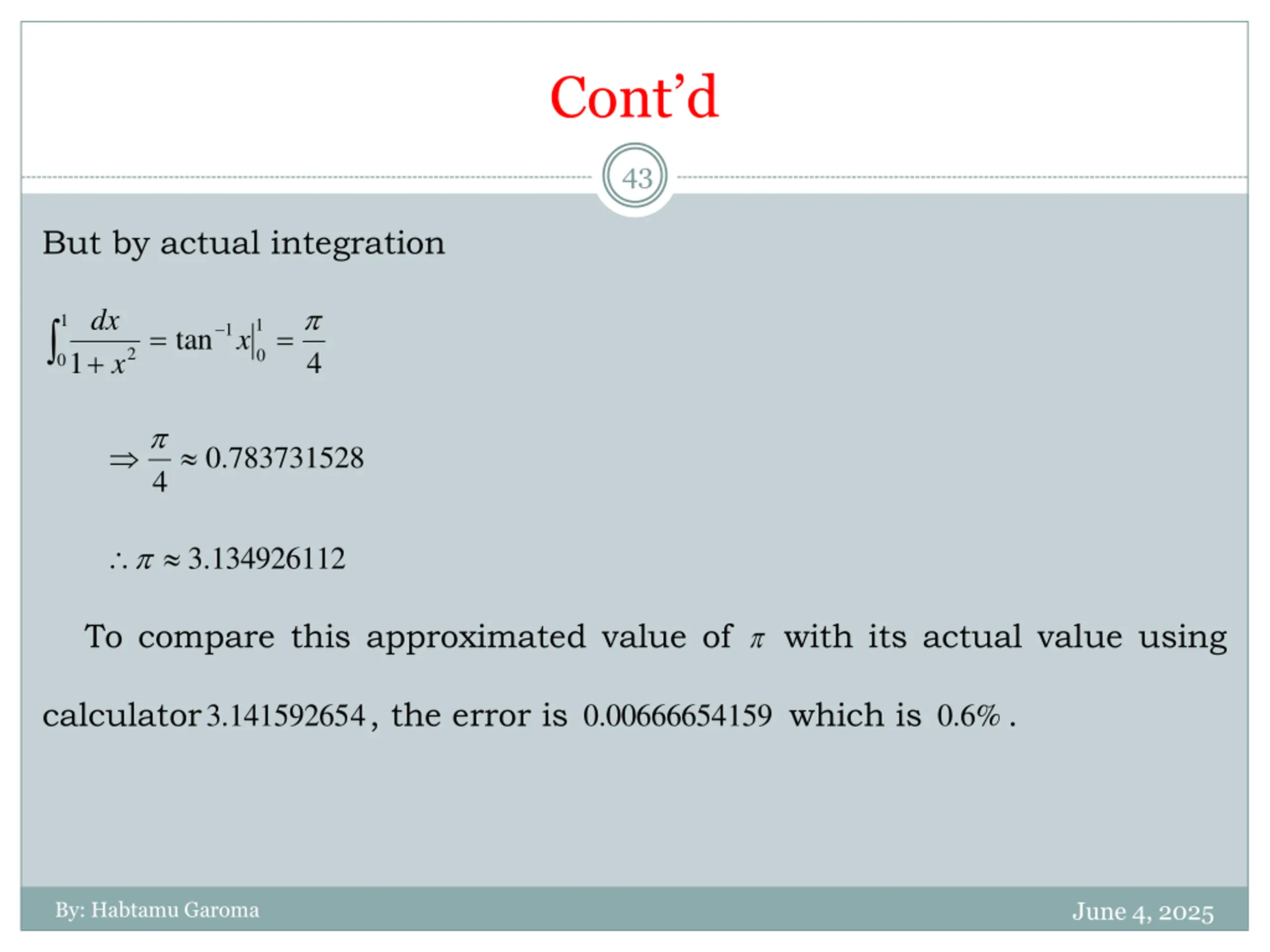 Contd 43 But by actual integration dx 1 1 = = 1 tan x + 2 0 1 4 x 0 4 783731528 . 0 134926112 . 3 To compare this approximated value of with its actual value using calculator 3.14159265 , the error is which is . 4 0.00666654 159 6 . 0 % June 4, 2025 By: Habtamu Garoma