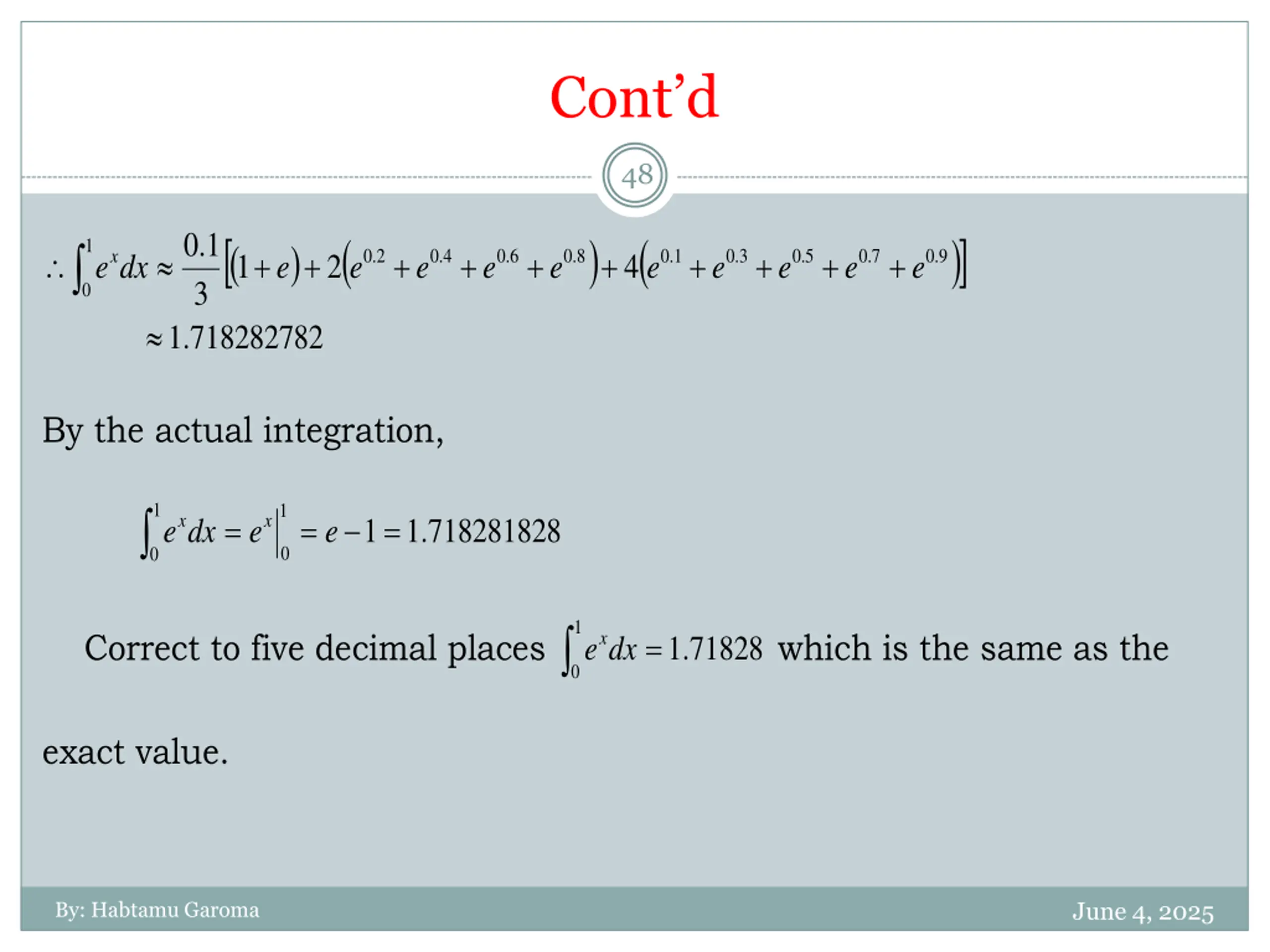 Contd 48 ( ) ( ) 1 . 0 ( ) 1 + + + + + + + + + + 2 . 0 e 4 . 0 e 6 . 0 e 8 . 0 e 1 . 0 e 3 . 0 e 5 . 0 e 7 . 0 e 9 . 0 e ex 1 2 4 dx e 3 0 718282782 . 1 By the actual integration, 1 1 = = 718281828 . 1 = x x 1 e dx e e 0 0 1 = Correct to five decimal places which is the same as the ex . 1 71828 dx 0 exact value. June 4, 2025 By: Habtamu Garoma
