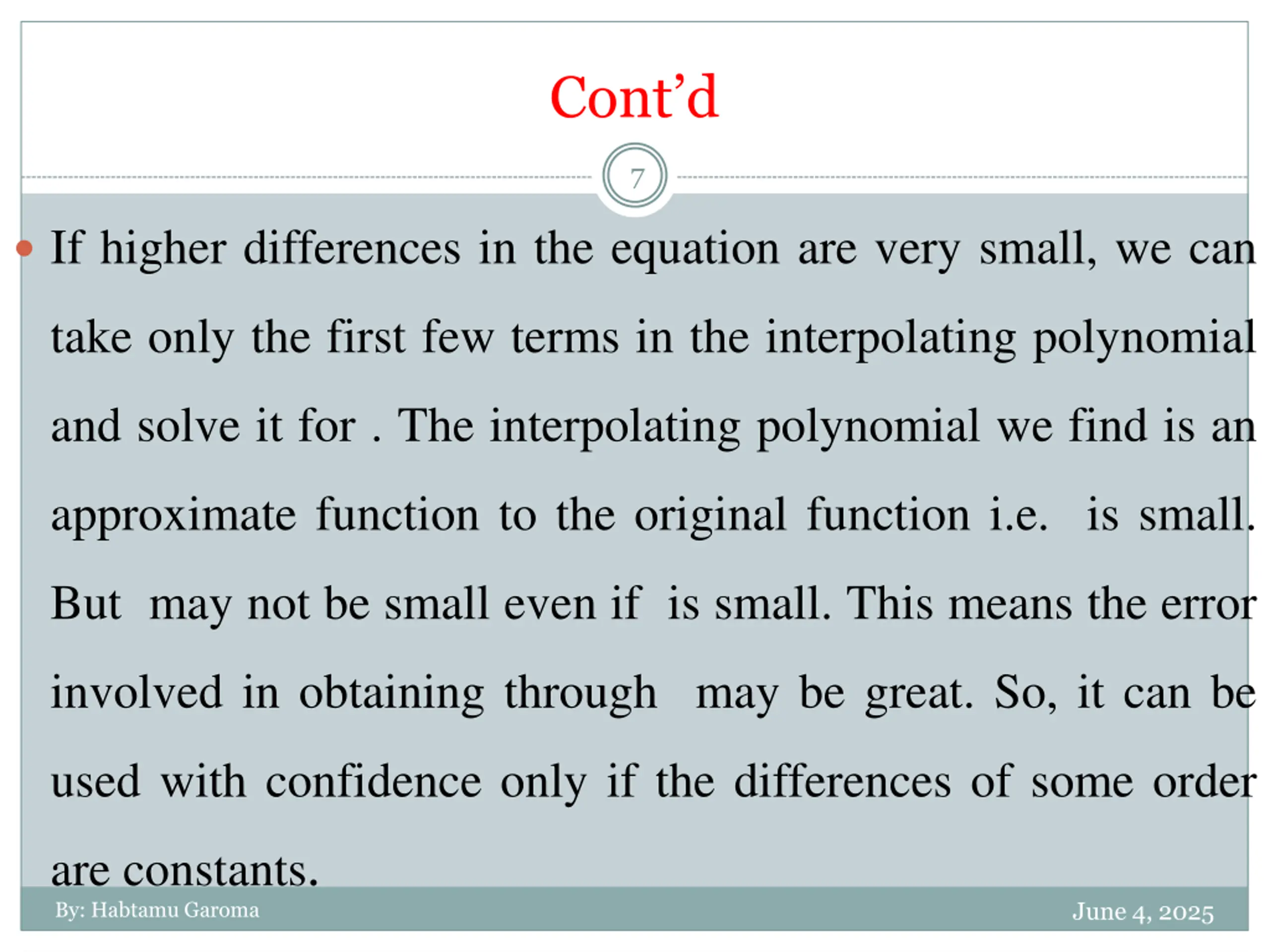 Contd 7 If higher differences in the equation are very small, we can take only the first few terms in the interpolating polynomial and solve it for . The interpolating polynomial we find is an approximate function to the original function i.e. is small. But may not be small even if is small. This means the error involved in obtaining through may be great. So, it can be used with confidence only if the differences of some order are constants. By: Habtamu Garoma June 4, 2025