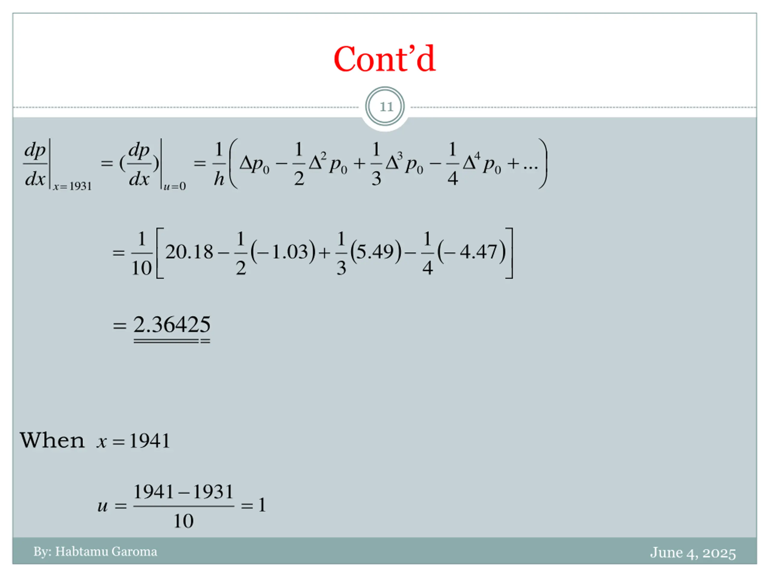 Contd 11 1 h 1 1 1 dp dp = = + + 2 3 4 ( ) ... p p p p 0 0 0 0 2 3 4 dx dx = = 1931 0 x u 1 1 1 1 ( ) ( . 5 ) ( ) = + 20 18 . . 1 03 49 . 4 47 10 2 3 4 = 3642 . 2 5 = When 1941 x 1941 1931 = = 1 u 10 June 4, 2025 By: Habtamu Garoma
