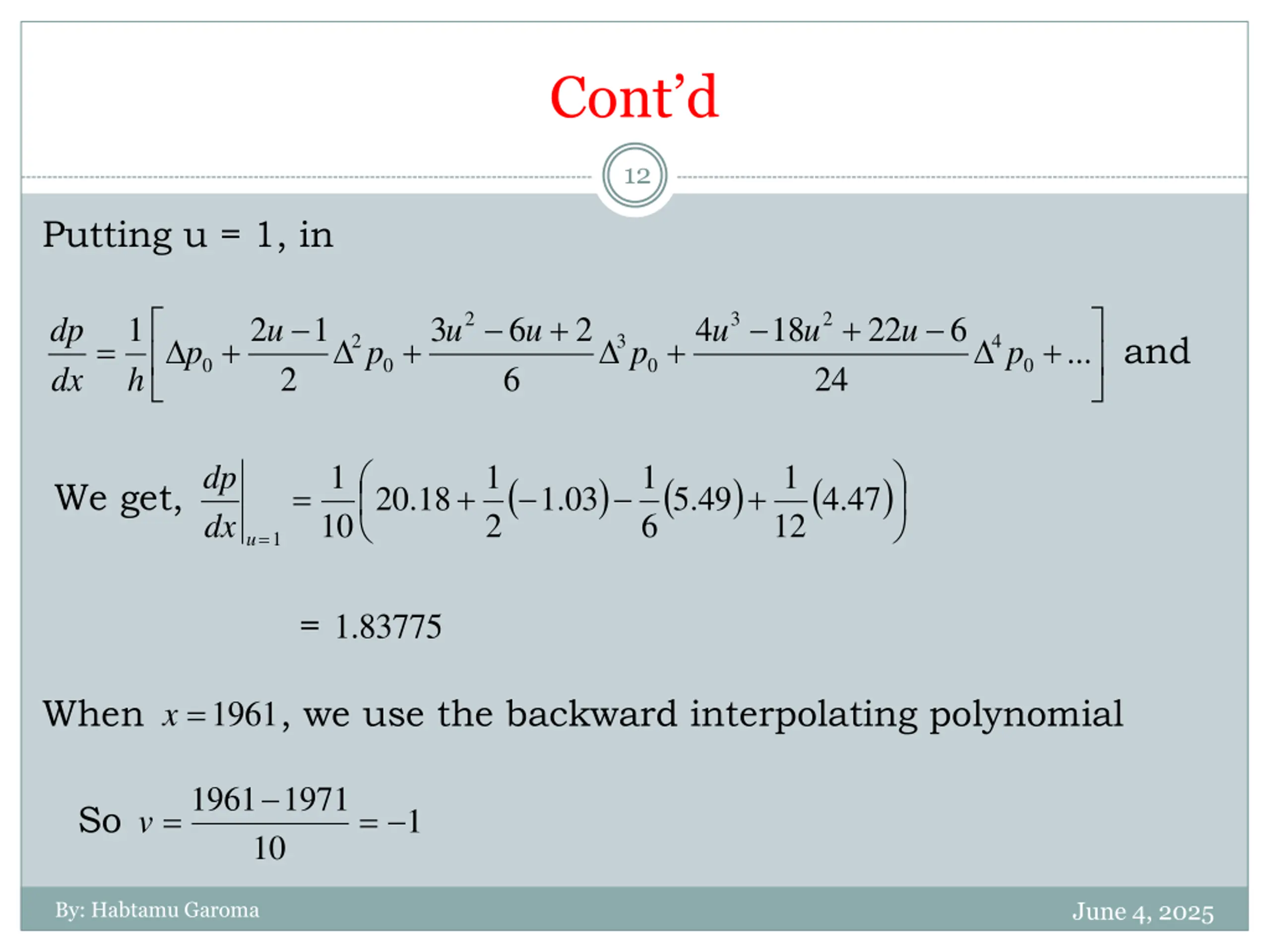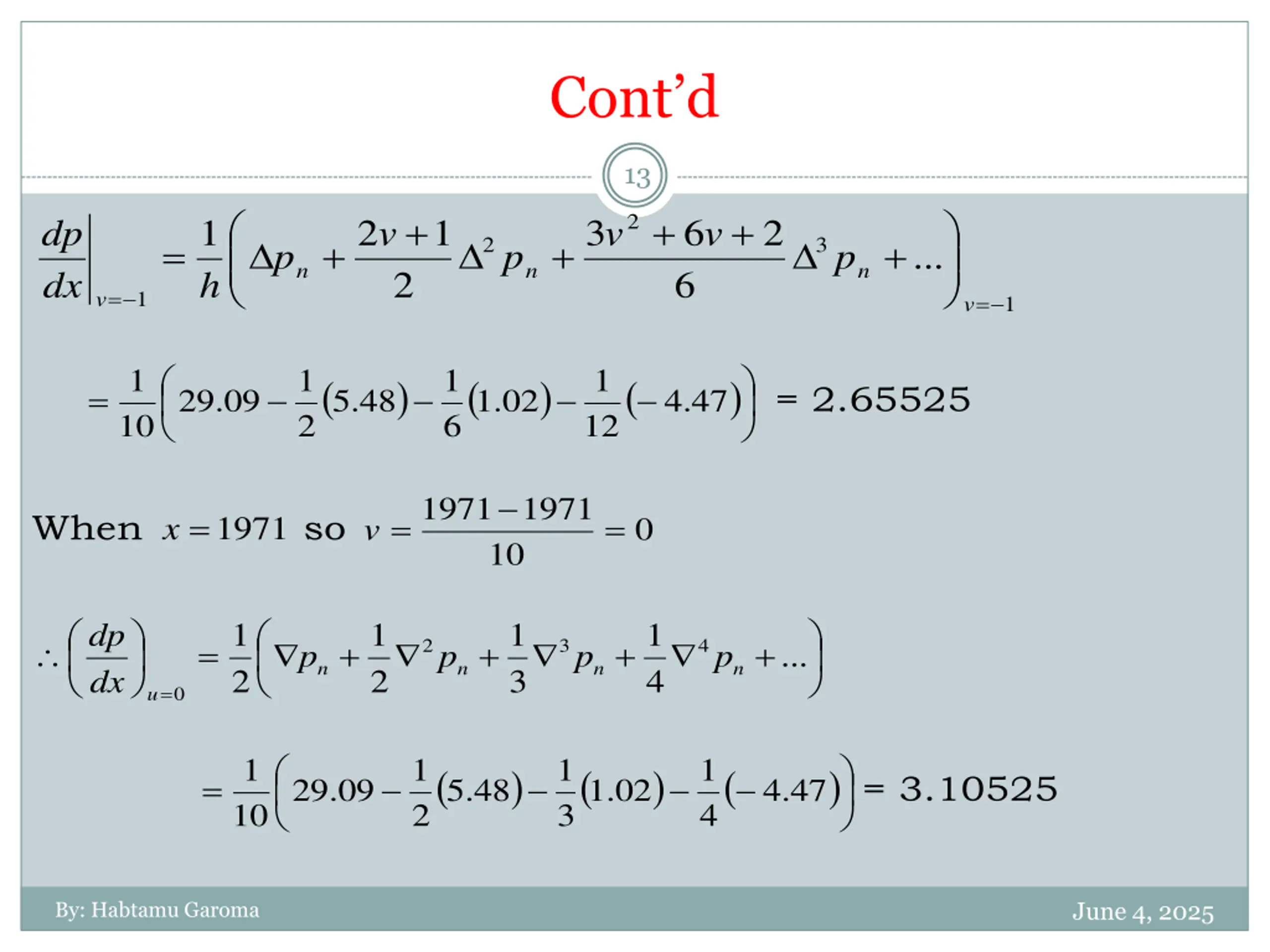 Contd 12 Putting u = 1, in + + 2 3 2 1 h 2 1 3 6 2 4 18 22 6 dp u u u u u u = + + + + and 2 3 4 ... p p p p 0 0 0 0 2 6 24 dx 1 1 1 1 dp ( ) ( . 5 ) ( . 4 ) We get, = + + 20 18 . . 1 03 49 47 10 2 6 12 dx = 1 u = 1.83775 = When , we use the backward interpolating polynomial 1961 x 1961 1971 So = = 1 v 10 June 4, 2025 By: Habtamu Garoma